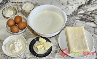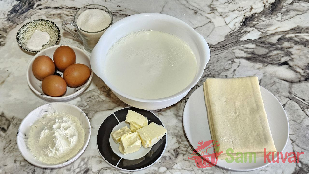 - Pripremite sve potrebne sastojke za lisnatu tortu sa poslastičarskim kremom.
