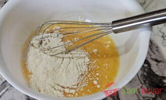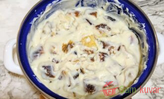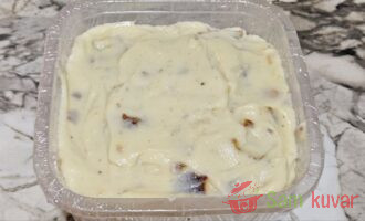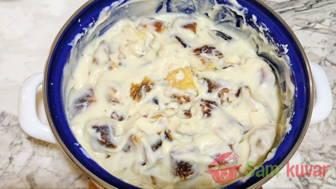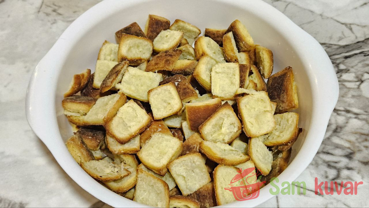 - Kada se krem ohladi, dodajte u njega pečene kvadrate od lisnatog testa i dobro izmešajte.