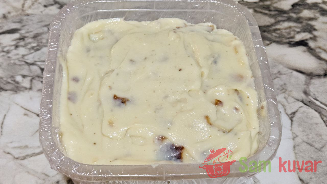 - Prebacite tortu u kalup i prekrijte providnom folijom. Ostavite u frižideru 10 sati da se stegne i natopi.