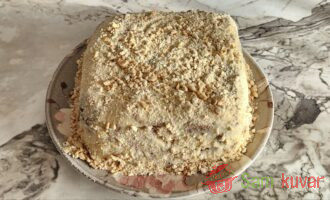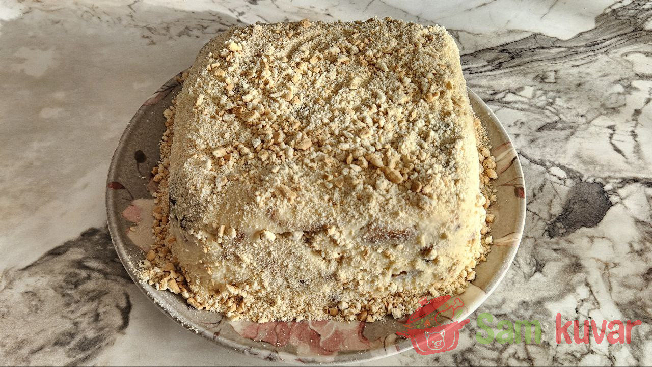 - Kada se torta stegne, izvadite je iz kalupa. Preostale kvadrate od testa sameljite u blenderu i pospite tortu mrvicama.