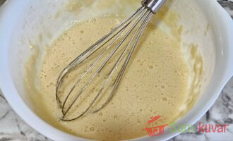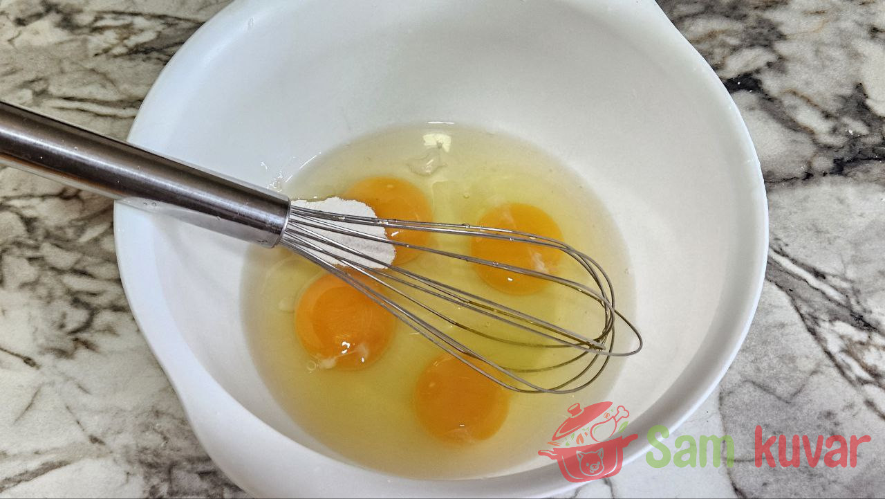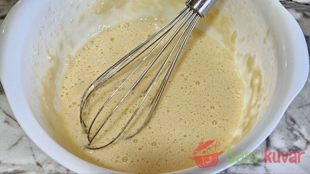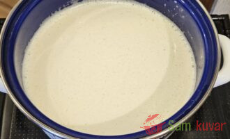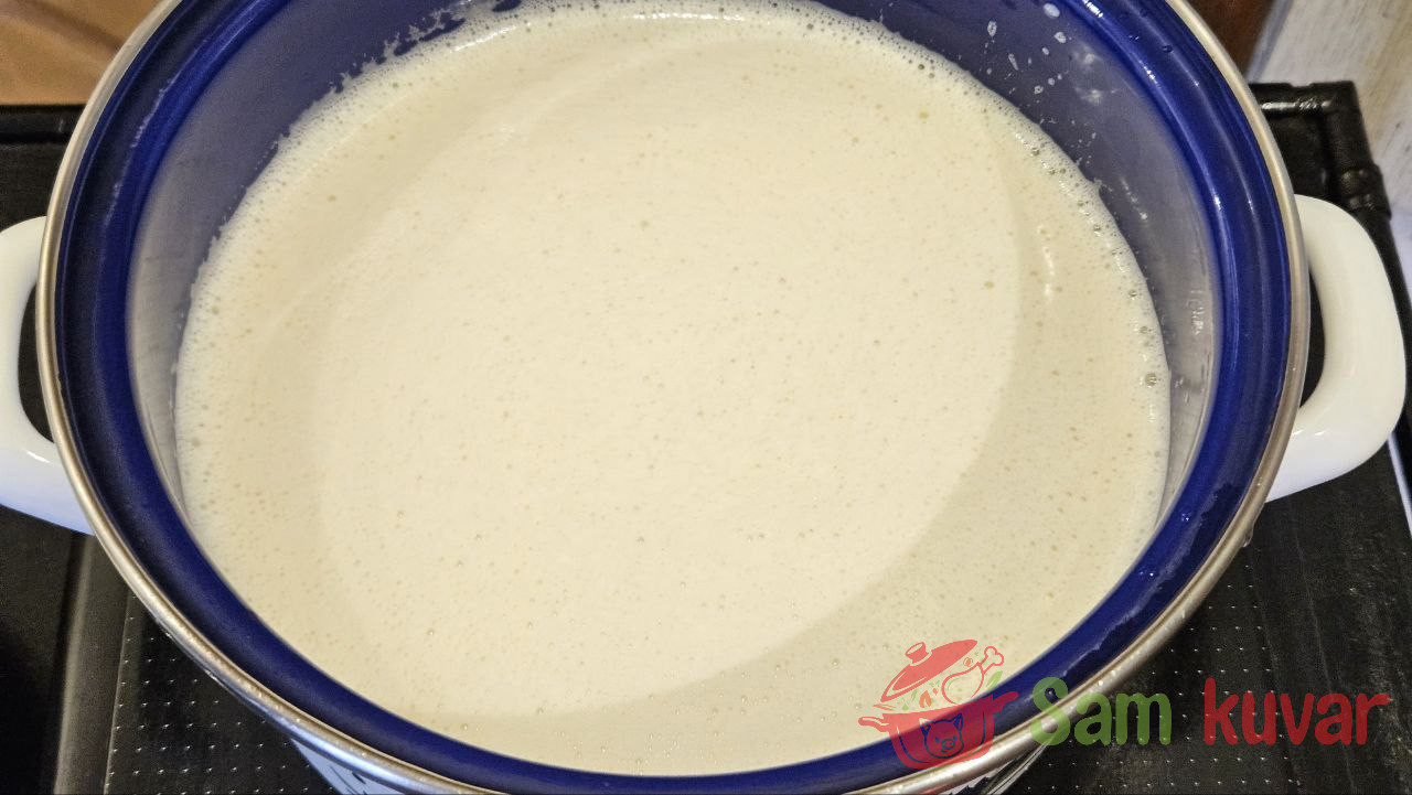 - U šerpi na tihoj vatri zagrejte mleko, dodajte šećer i mešajte dok se šećer potpuno ne rastvori. Zatim, uz neprestano mešanje, pažljivo sipajte smesu sa jajima. Kuvajte dok se krem ne zgusne, vodeći računa da ne zagori.