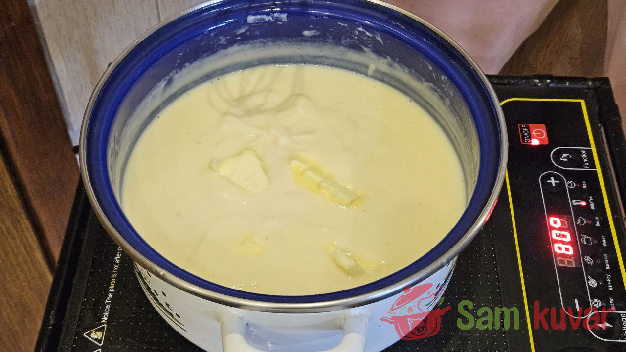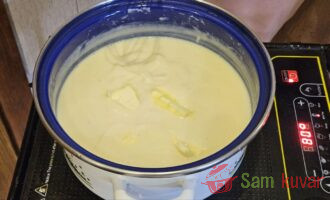 - Kada se krem zgusne, dodajte maslac i mešajte dok se potpuno ne otopi. Isključite ringlu i ostavite krem da se ohladi.
