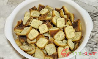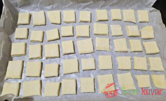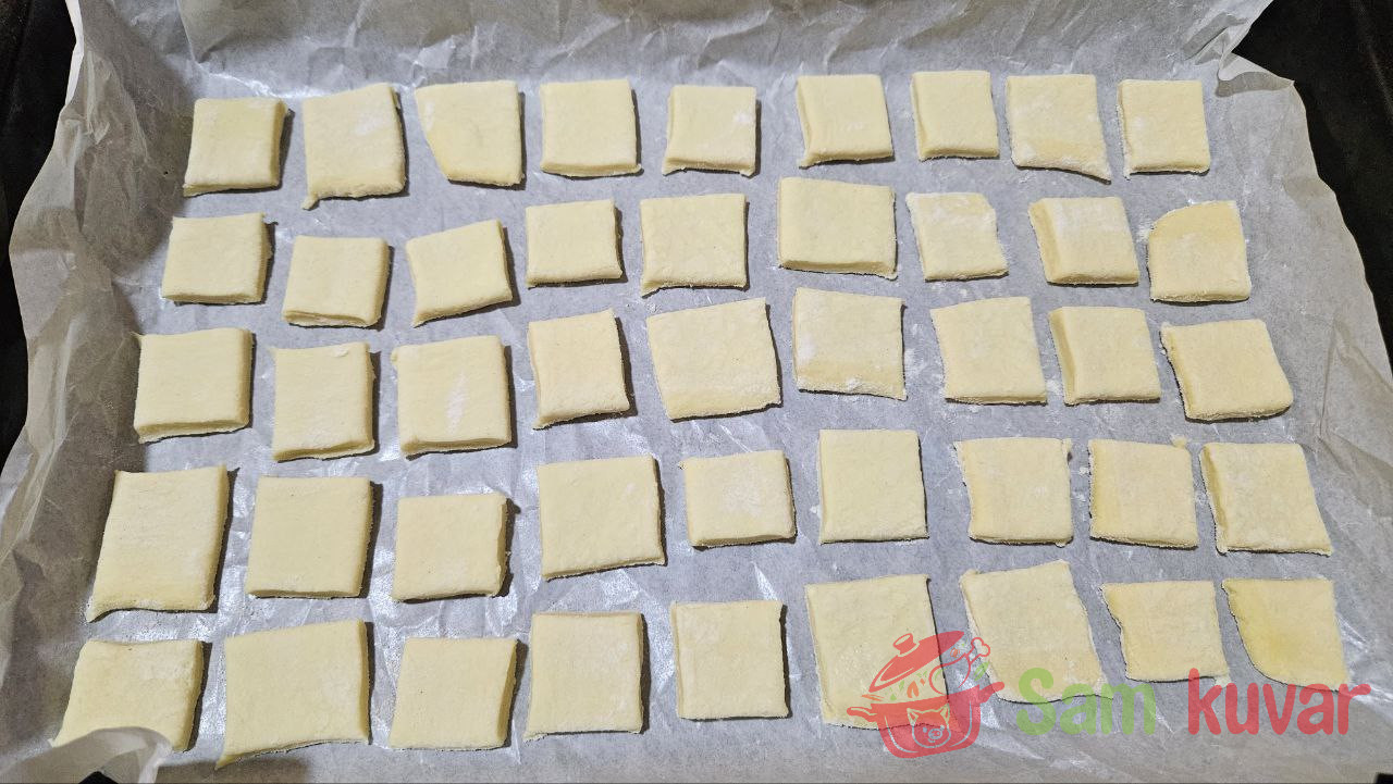 - Lisnato testo razvucite i isecite na male kvadrate. Ređajte ih na pleh i pecite u rerni 10 minuta na 220°C.