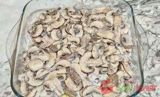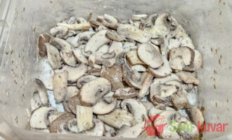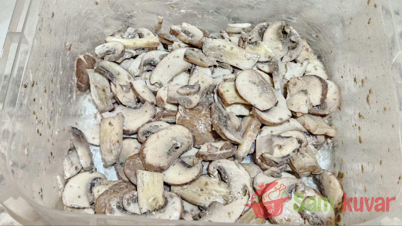 - Pečurke isecite na kriške, posolite, dodajte malo majoneza i promešajte.
