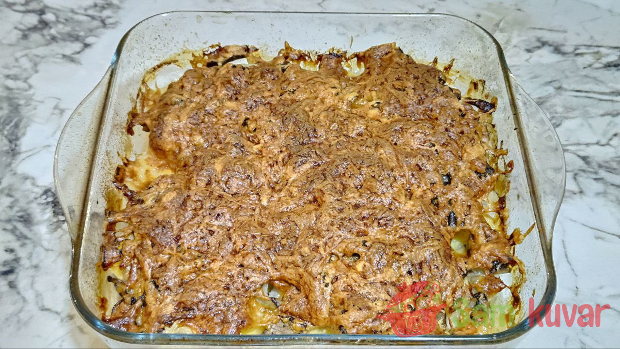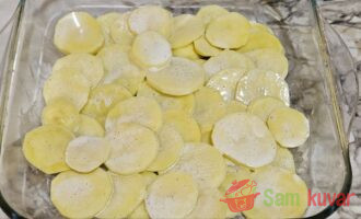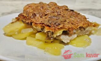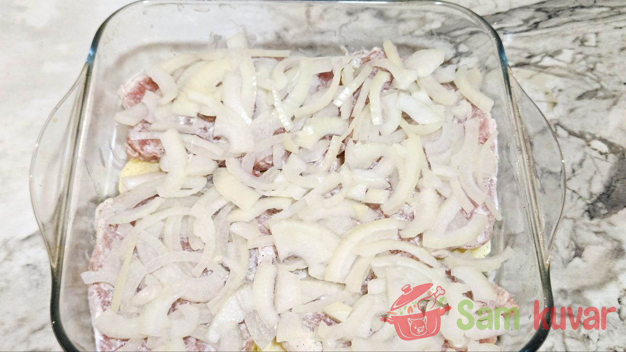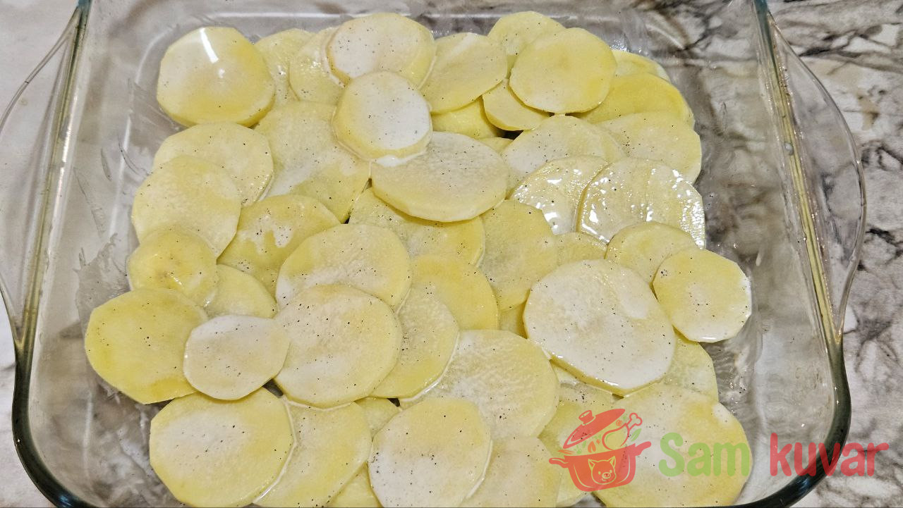 - U pleh za pečenje poređajte na dno kolutove krompira.