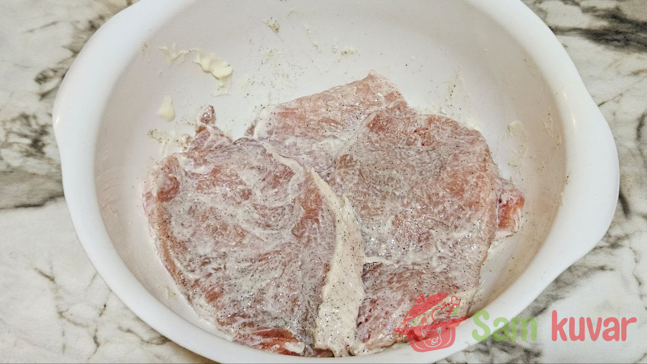 - Svinjski kare malo izlupajte. Posolite i pobiberite. Uzmite 1 veliku kašiku majoneza i premažite svaki komad mesa. Ostavite da se marinira.