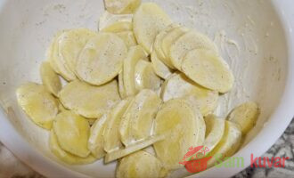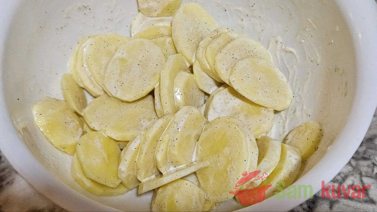 - Krompir oljuštite i isecite na tanke kolutove. Posolite, pobiberite i dodajte preostali majonez. Dobro promešajte.