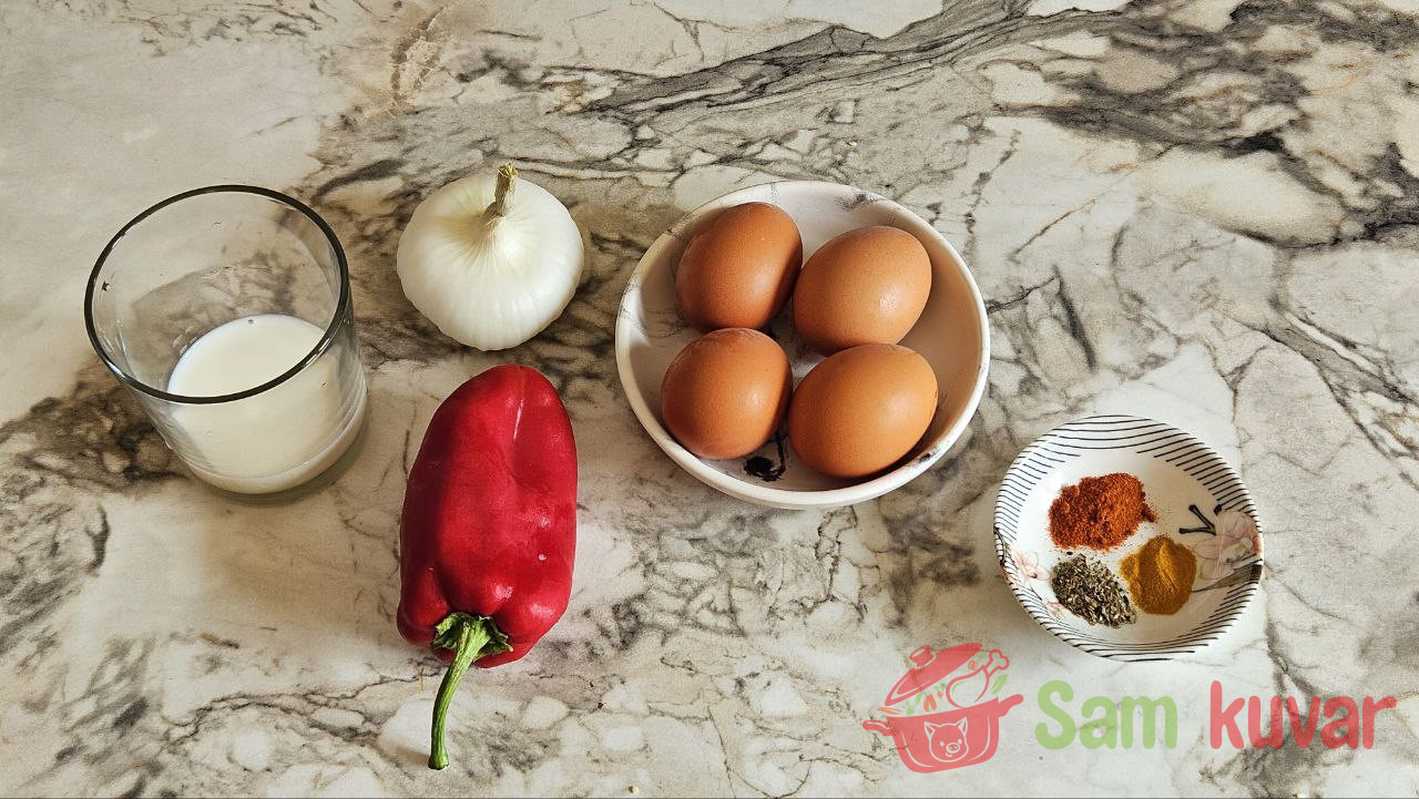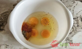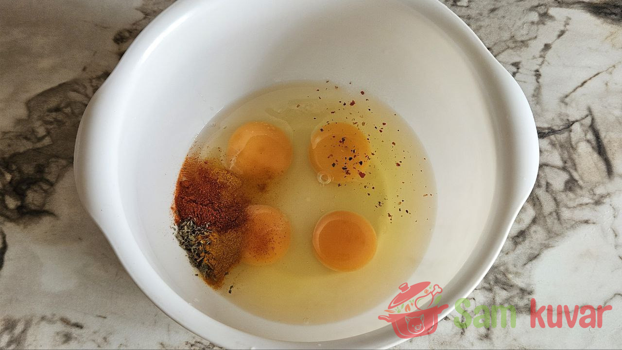 - U dublju posudu razbijte jaja, dodajte mlevenu papriku, bosiljak i kurkumu. Posolite i pobiberite. Dobro umutite začine sa jajima žicom ili mikserom.