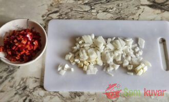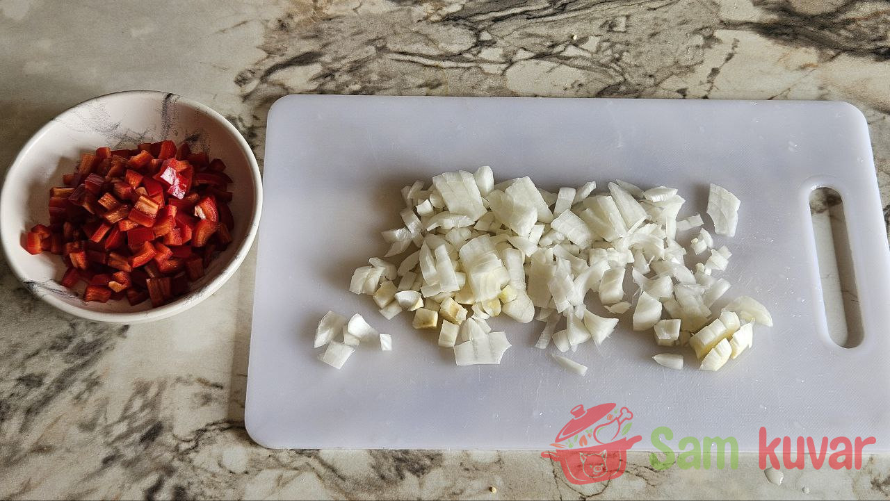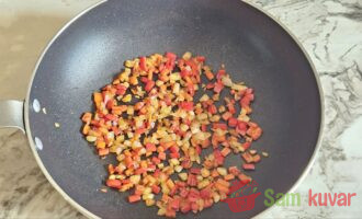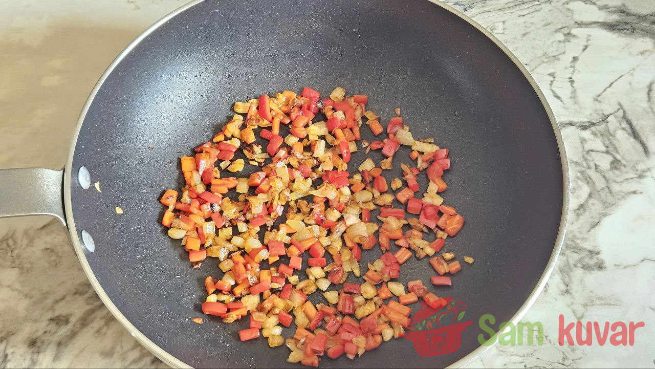 - Na zagrejan tiganj sa malo ulja stavite luk i papriku i pržite na jakoj vatri dok povrće ne omekša.