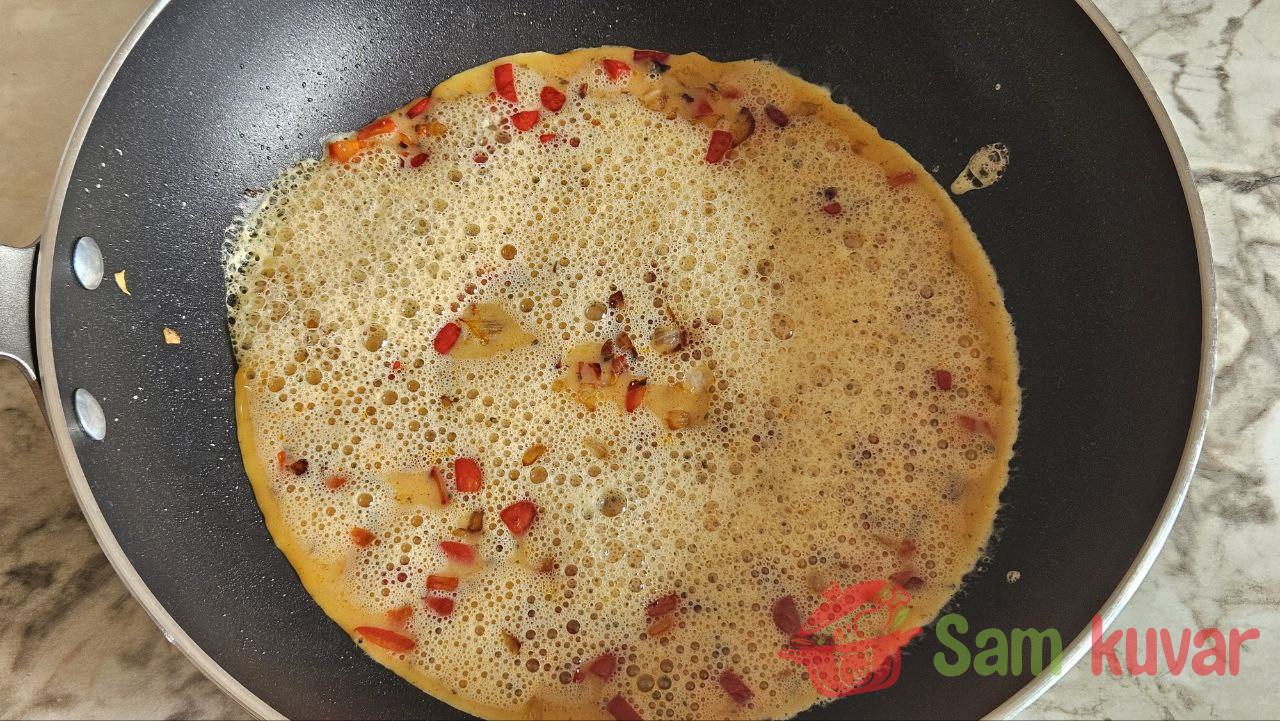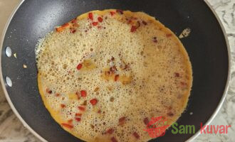 - Kada se povrće isprži, sipajte umućenu smesu od jaja. Smanjite temperaturu na minimum i poklopite. Pecite 5–7 minuta dok se omlet ne stegne. Poklopac ne otvarajte. Da proverite da li je gotov, malo protresite tiganj – ako nema tečnih talasa, omlet je spreman.