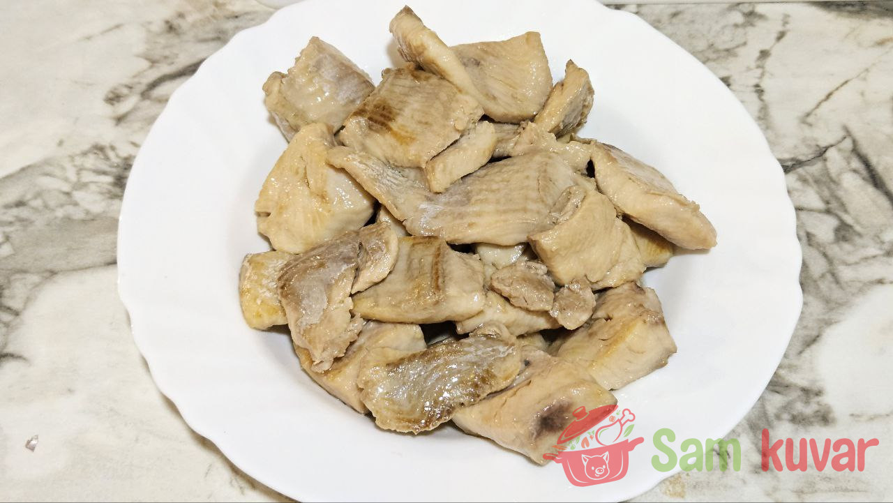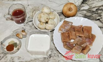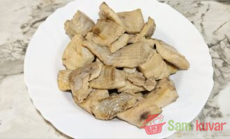 - Pripremite potrebne sastojke za pripremu pastrmke u sosu od pečuraka. File isecite na manje komade i malo posolite.