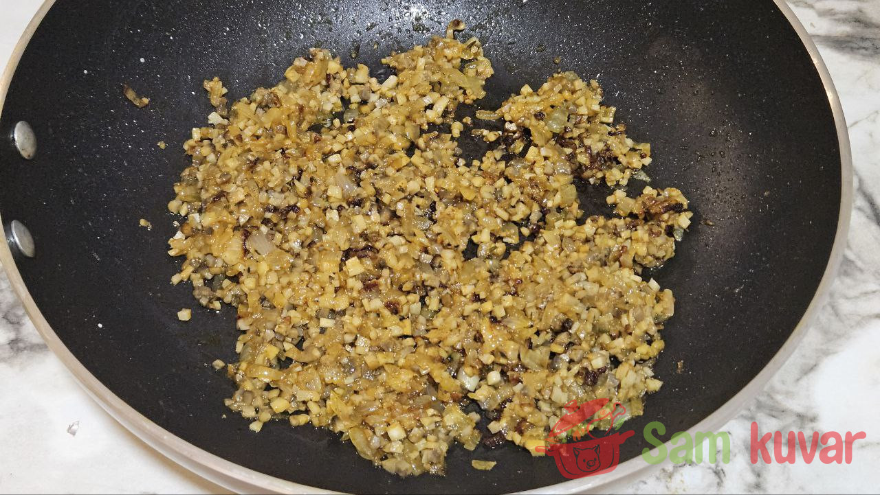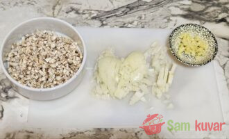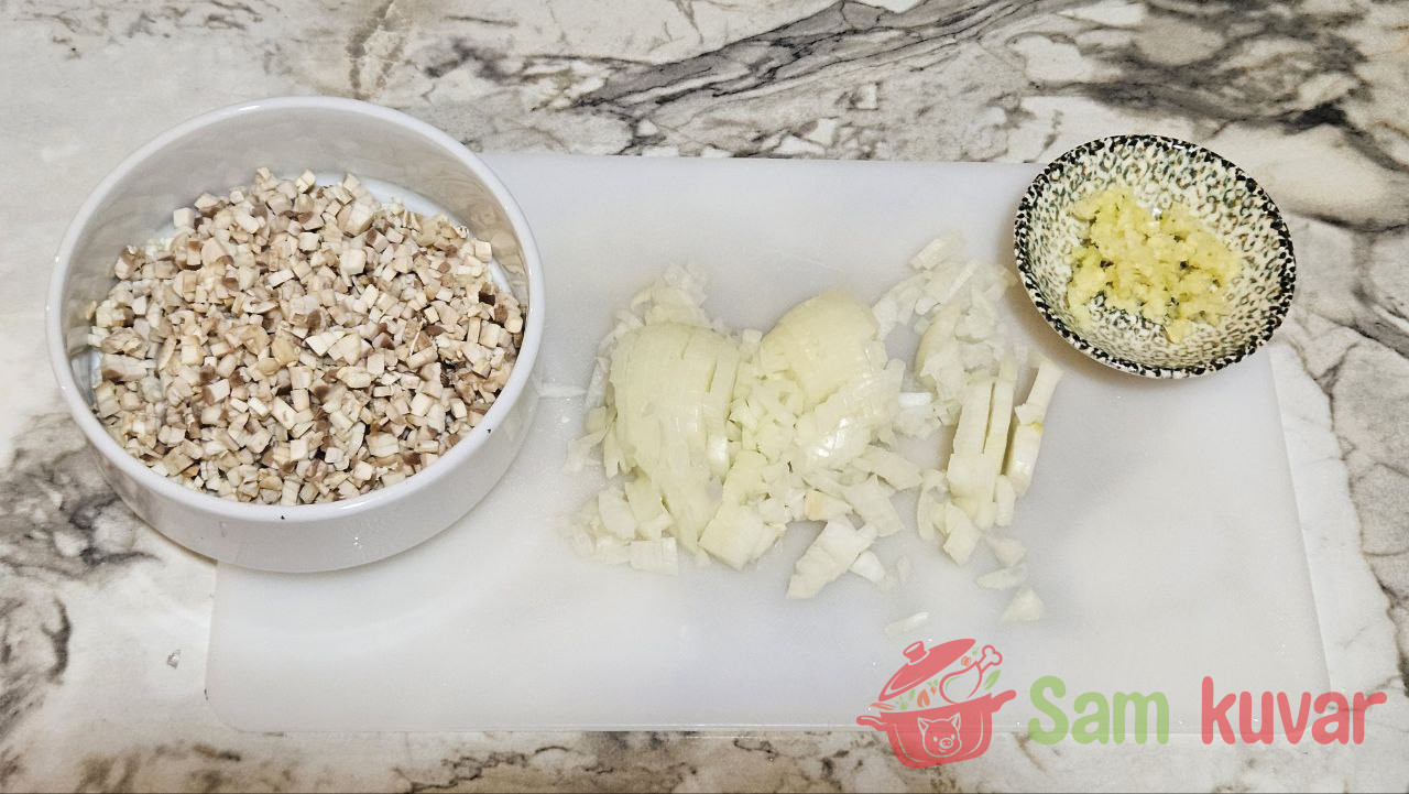 - Šampinjone isecite na male kockice, a luk i beli luk sitno iseckajte.
