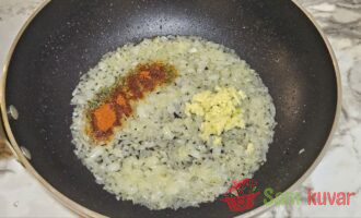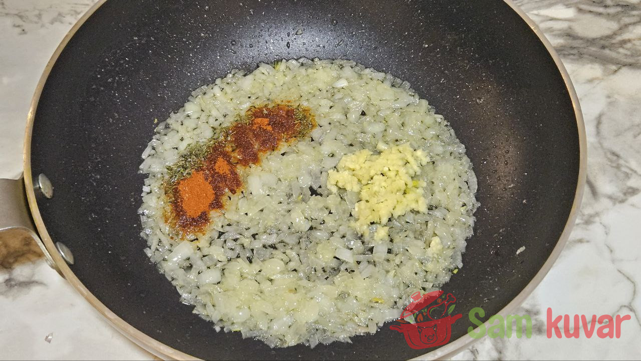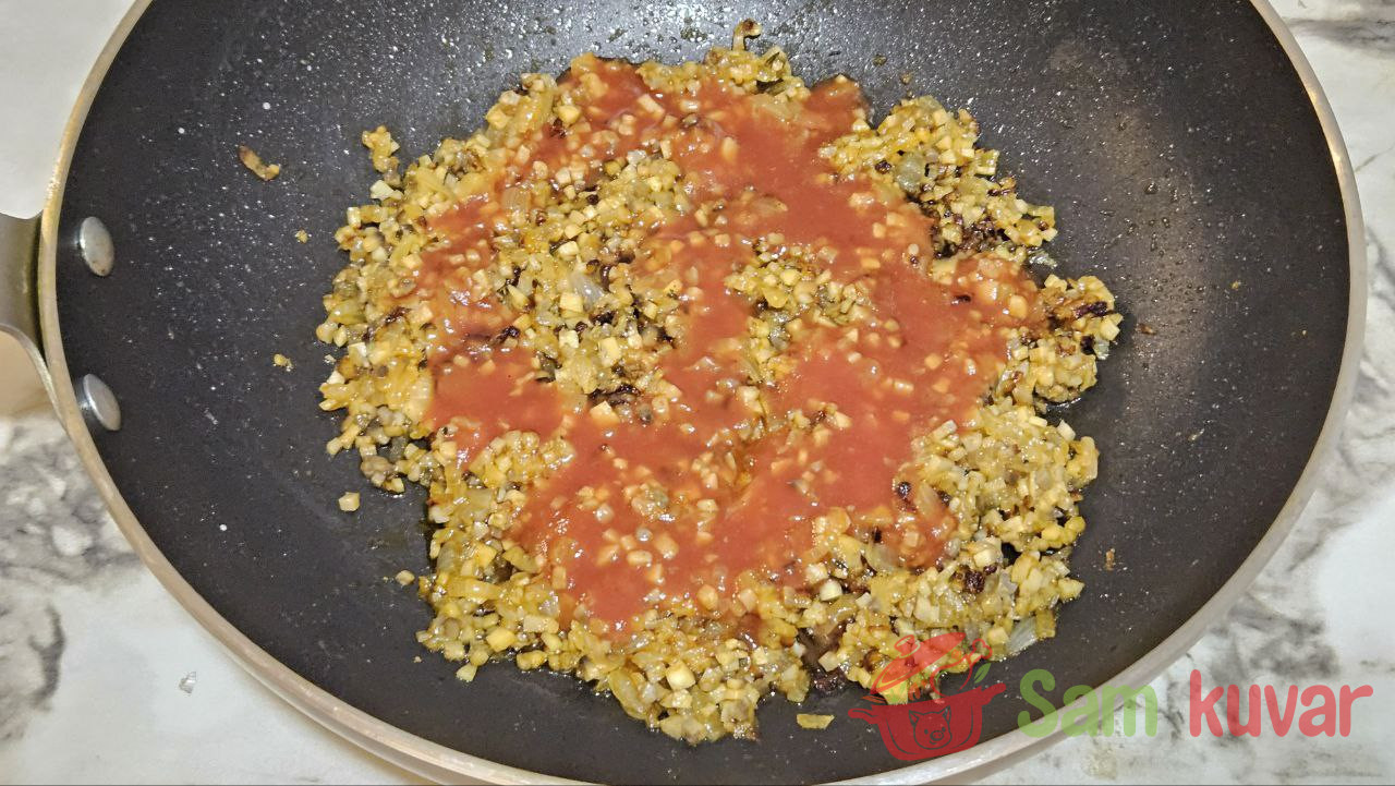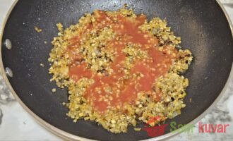 - Dodajte paradajz pire i izmešajte. Malo posolite.