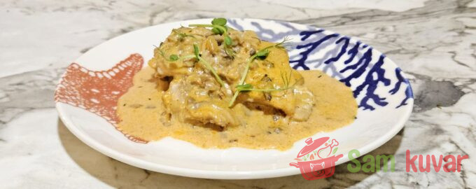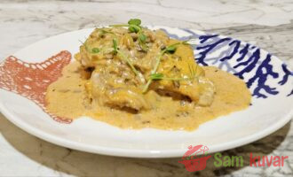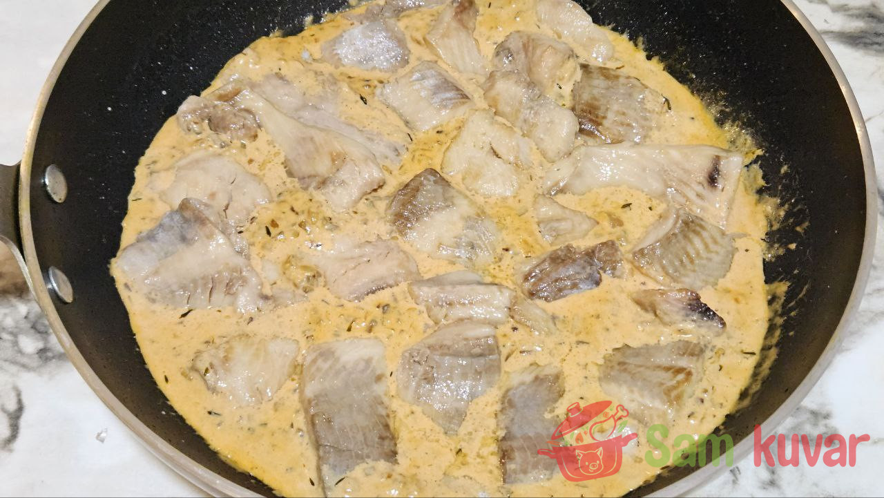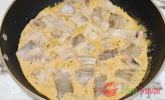 - Pažljivo vratite komade ribe u sos i dinstajte pod poklopcem na niskoj temperaturi 15 minuta.