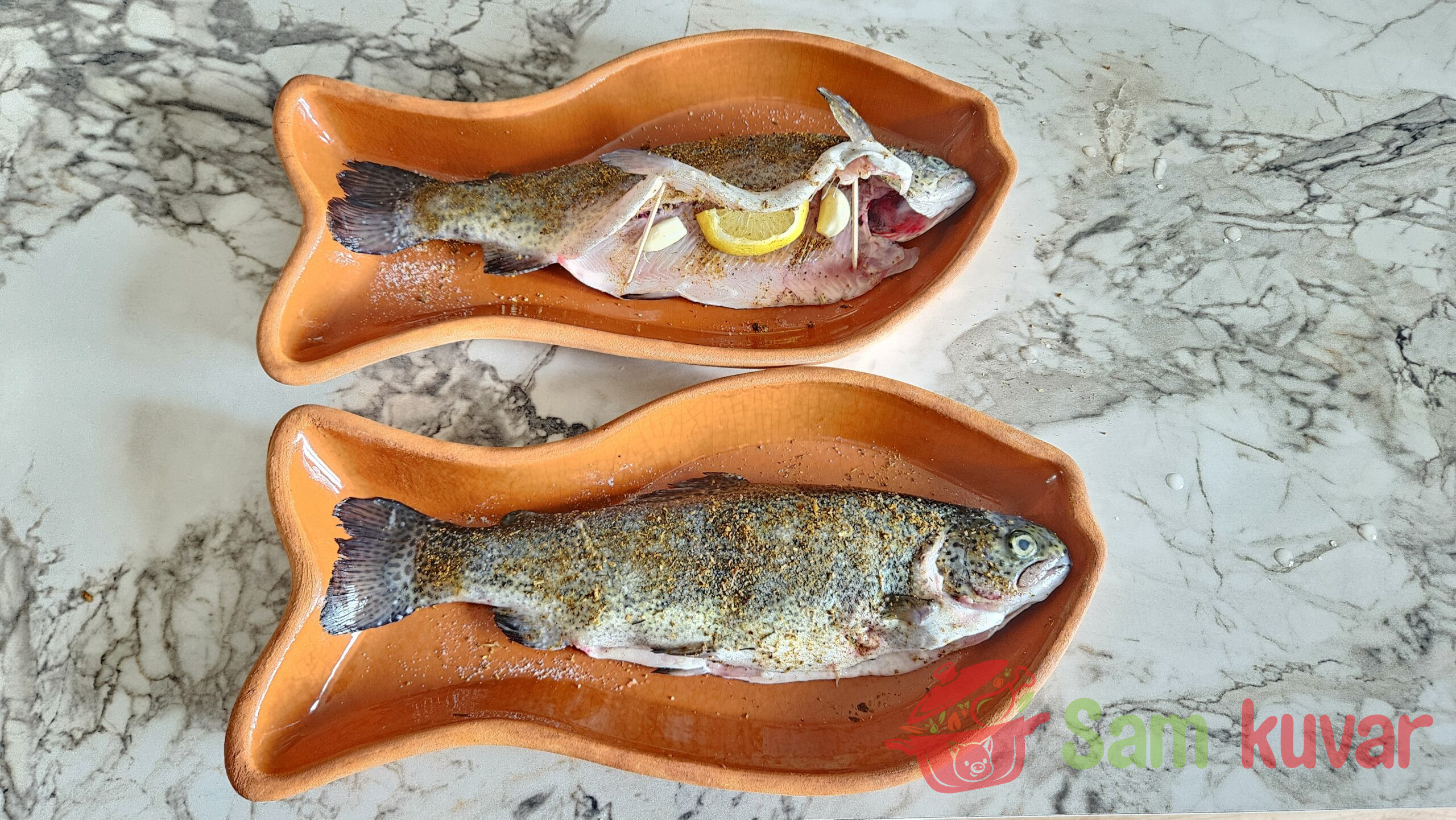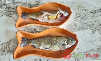 - Svaku ribu pospite solju i začinima sa obe strane i iznutra. Unutra svake ribe stavite jednu krišku limuna i dva čena češnjaka. Uvijte ribu u kesu i stavite u frižider na sat ili više, da riba upije so i začine.