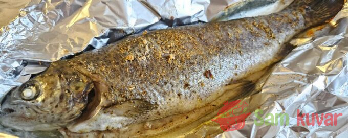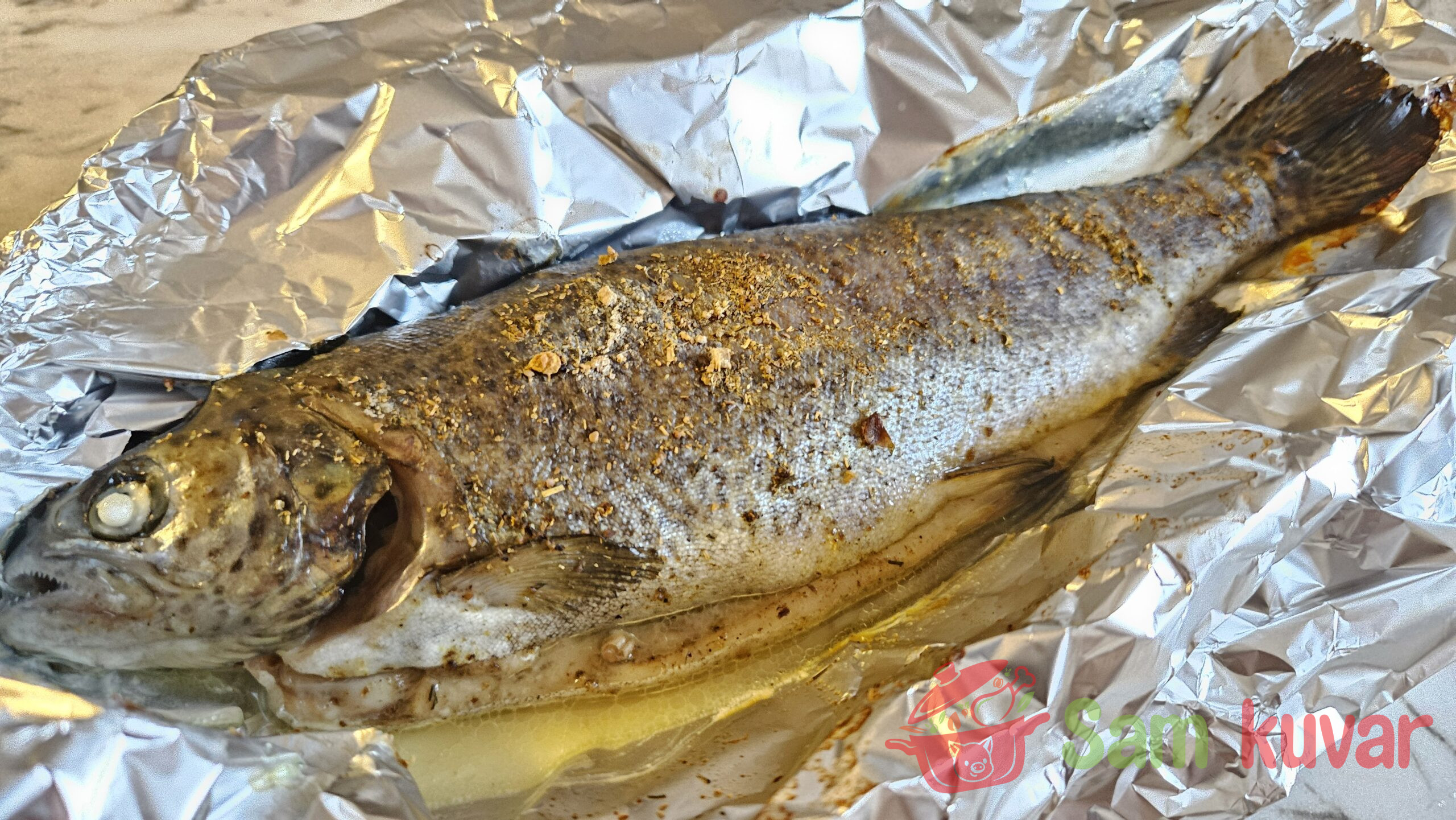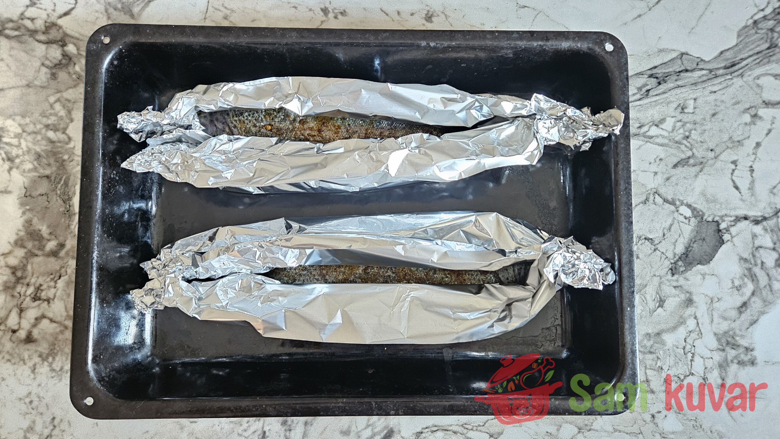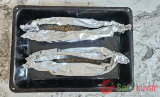 - Kada se riba umarije, uvijte svaku ribu u foliju u obliku čunja, ostavivši mali otvor na vrhu, i stavite u rernu na 200 stepeni na 30 ili 40 minuta (u zavisnosti od veličine ribe).