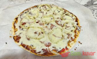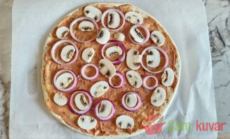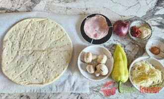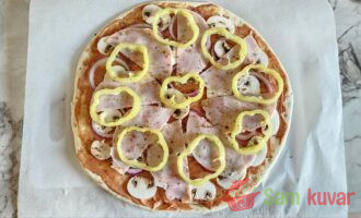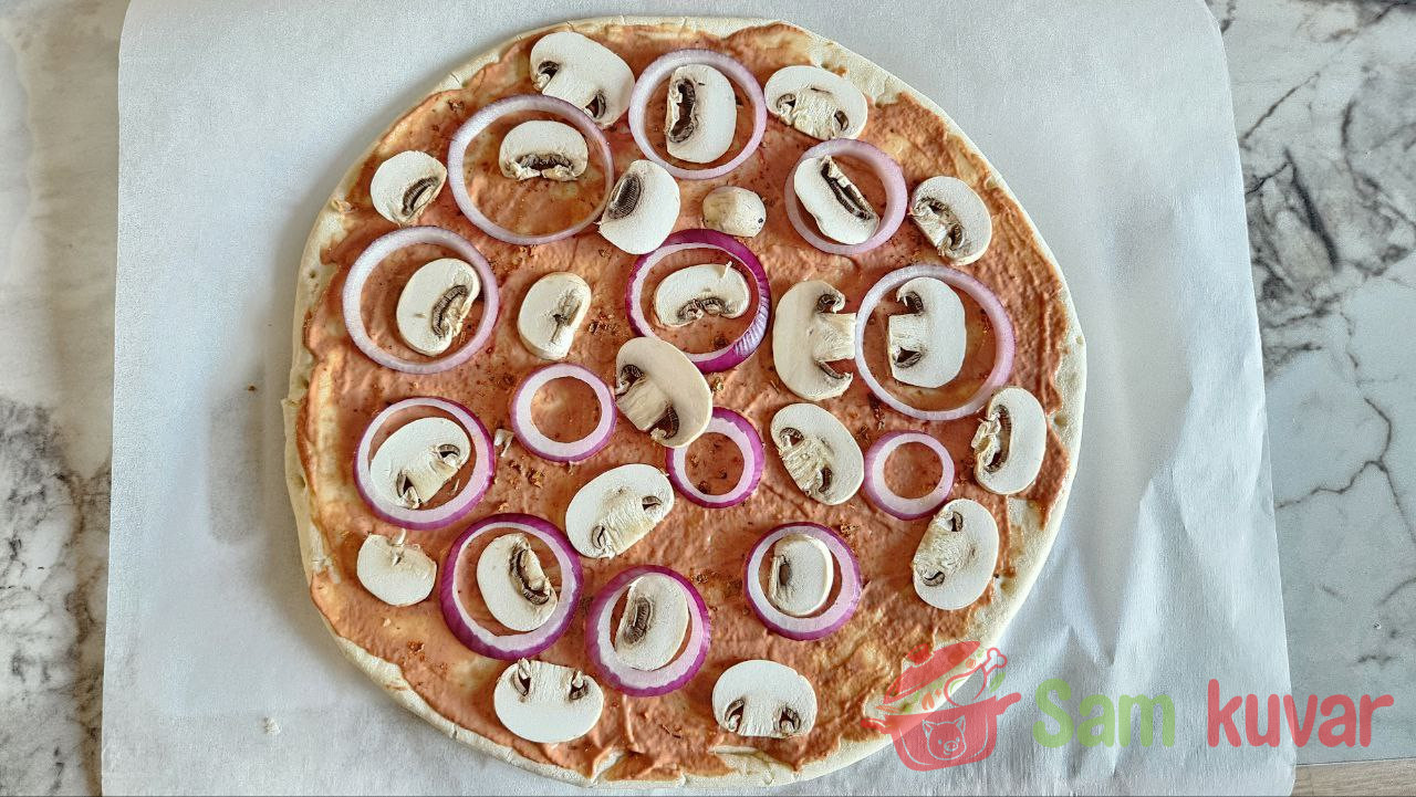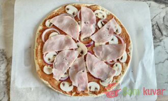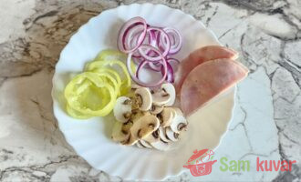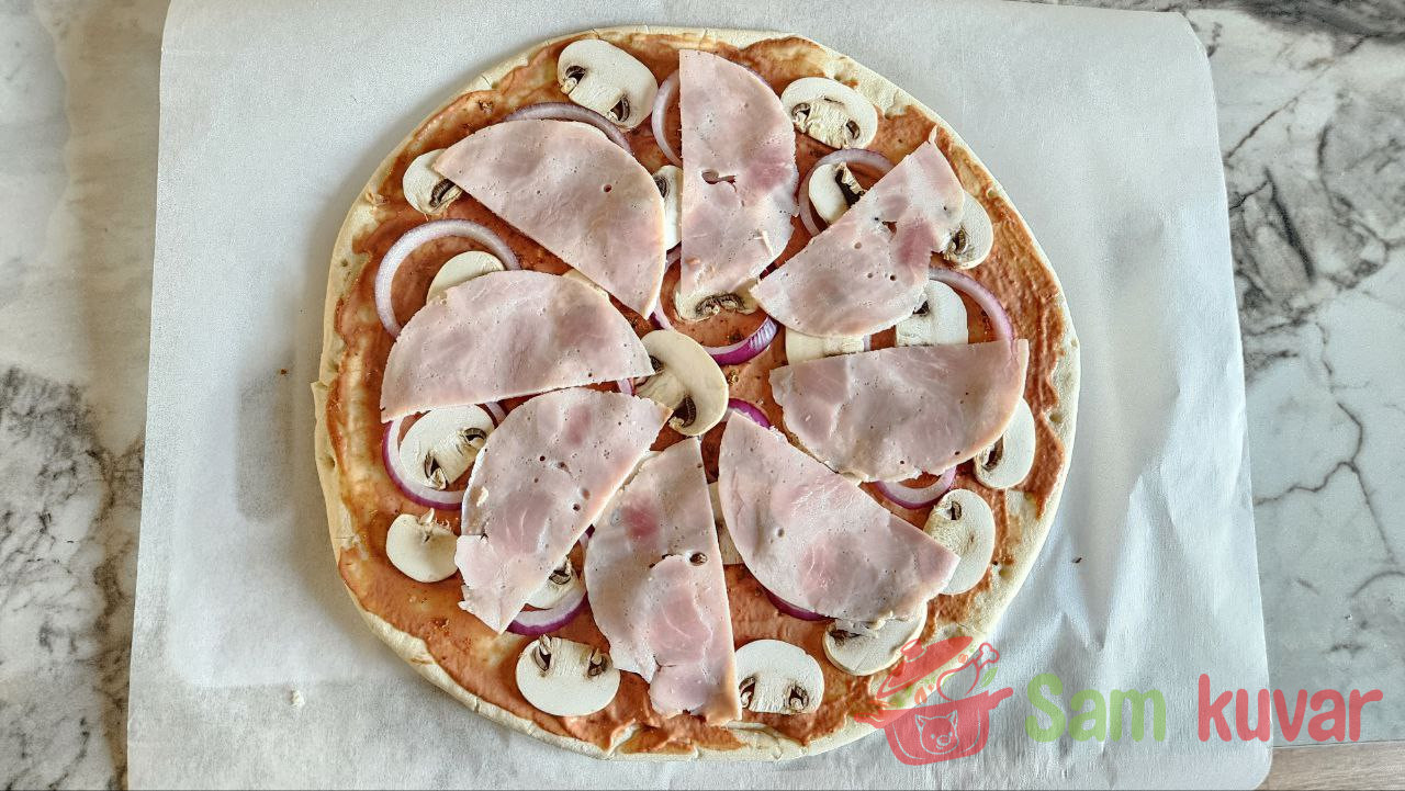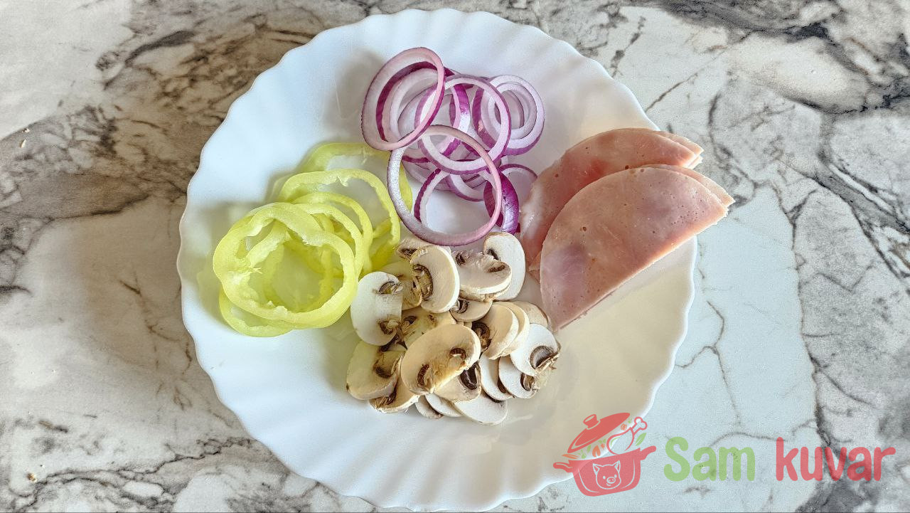 - Crveni luk i papriku isecite na kolutove, šampinjone na tanke kriške, a šunku na polukrugove. Na ovaj način sastojci će se ravnomerno rasporediti po testu i svako parče pice biće bogato ukusom.