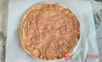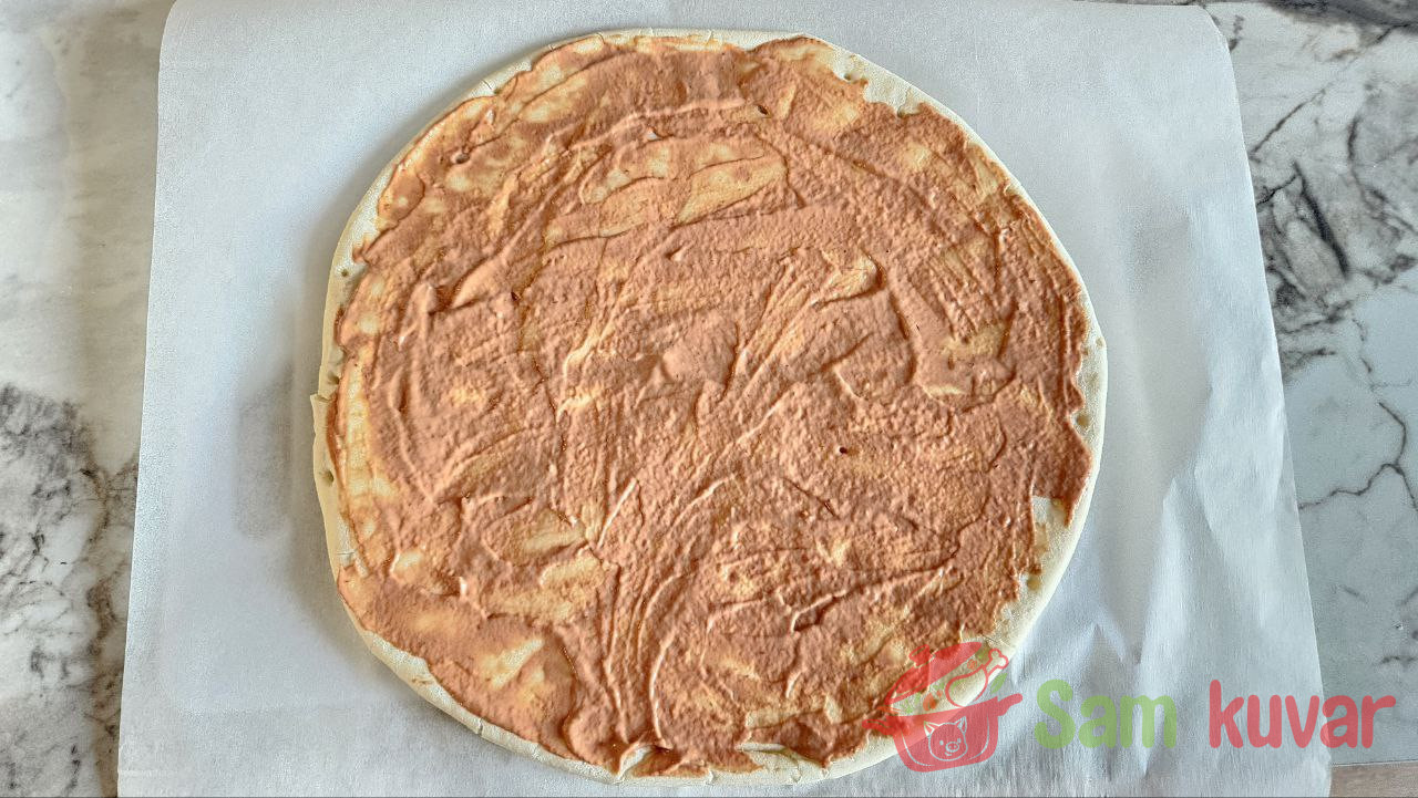 - Pomešajte paradajz pastu i majonez dok ne dobijete ujednačenu i kremastu smesu. Ovim sosom premažite pripremljeno testo za picu. Dodajte polovinu začina za picu i lagano ih rasporedite.