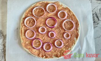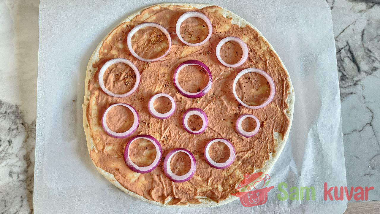 - Najpre poređajte kolutove crvenog luka, koji će dati blagu slatkoću.