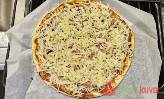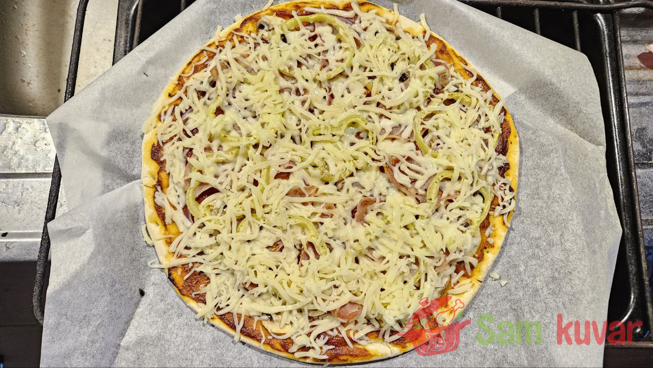 - Kada je pica gotovo pečena, izvadite je, obilno pospite rendanom mocarelom i vratite u rernu na još 5 minuta dok se sir ne istopi i ne postane savršeno rastegljiv.