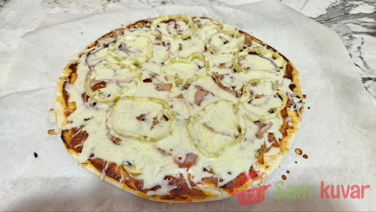 - Vaša domaća pica je spremna! Isecite je na trouglove i poslužite dok je još vruća. Prijatno! 🍕