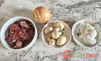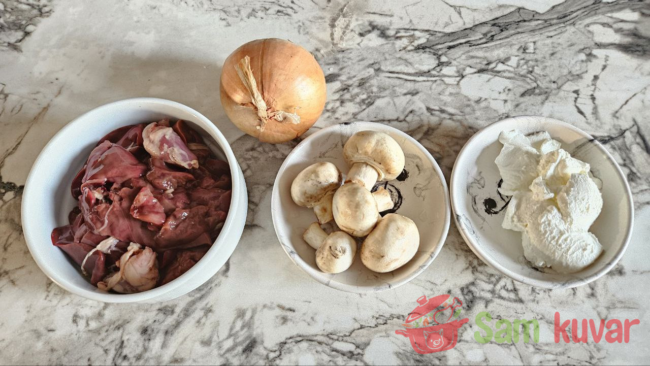 - Pripremite potrebne sastojke za pripremu pileće džigerice sa pečurkama.