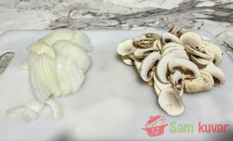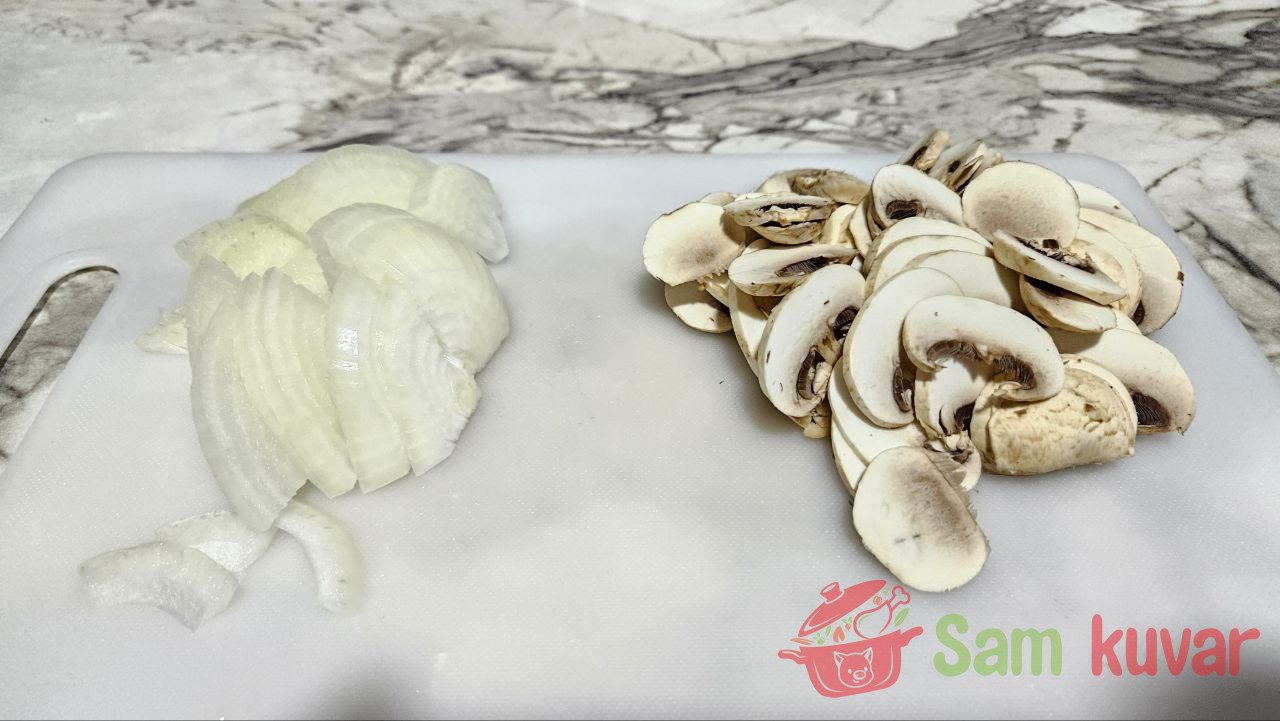 - Pečurke isecite na listiće, a luk na četvrtine kolutova.