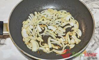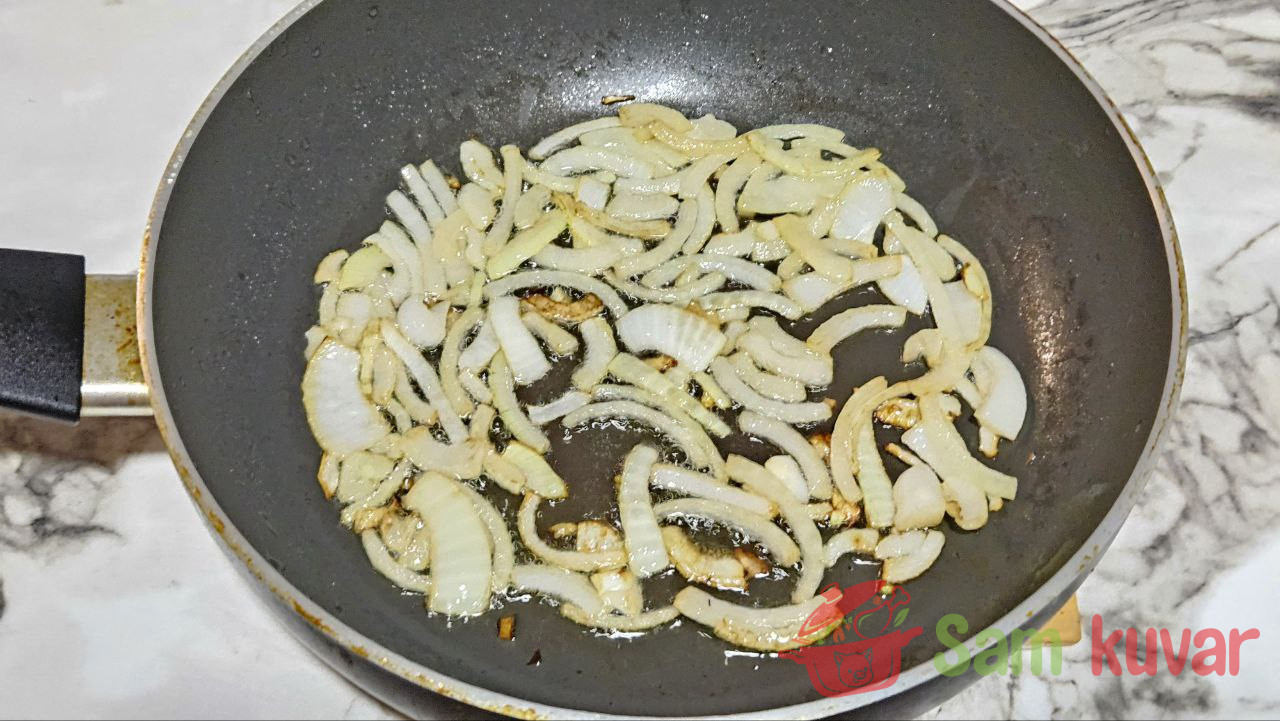 - Na zagrejanom ulju propržite luk do zlatnožute boje.