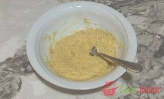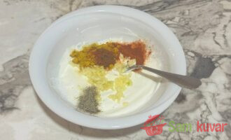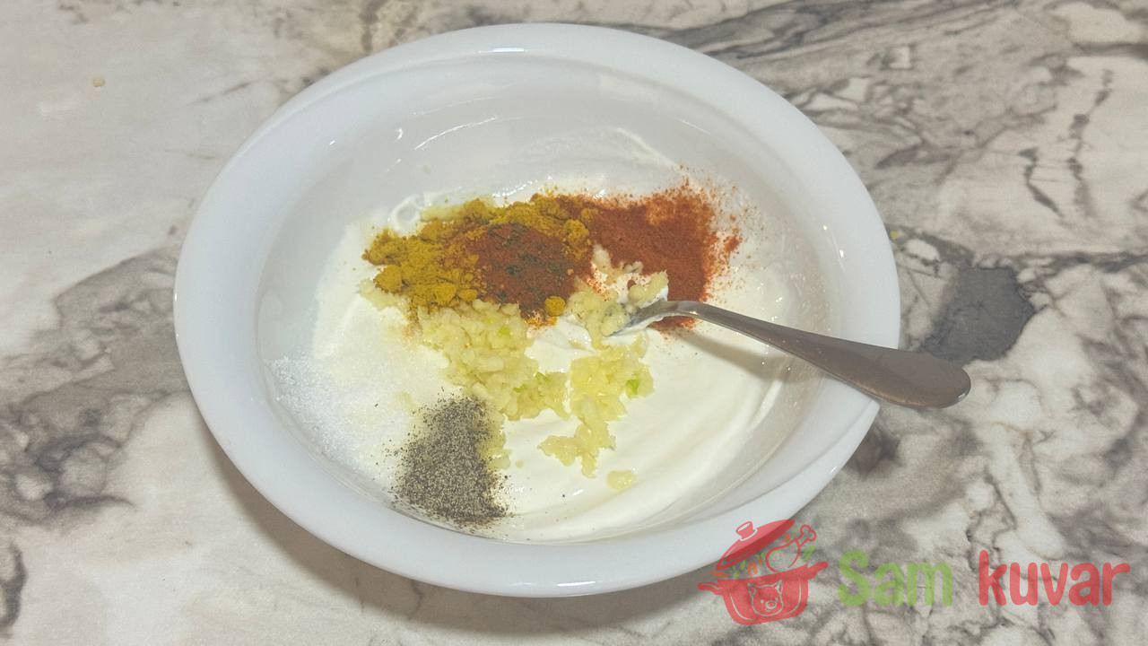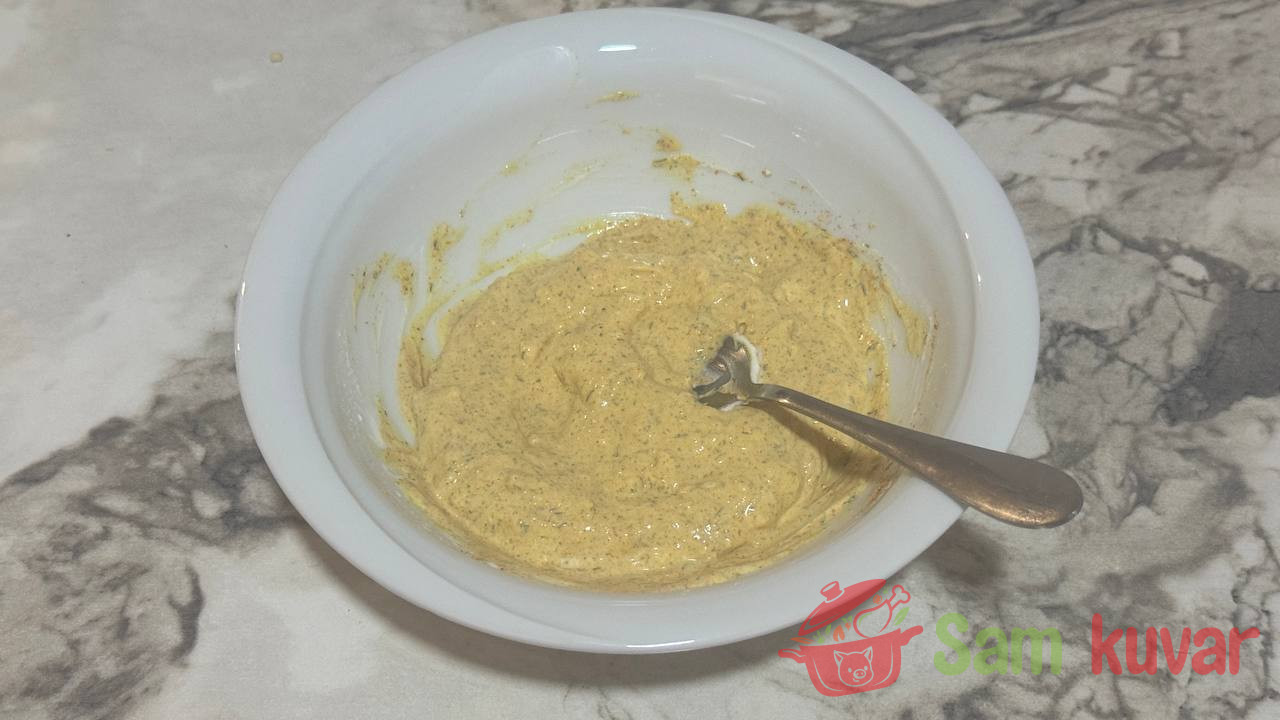 - Najpre pripremite marinadu. U manju činiju stavite pavlaku (po potrebi je možete malo razblažiti sa malo mleka ili vode), jedan čen belog luka propasiran kroz presu, mlevenu papriku, kurkumu, sušeni mirođija, so i biber.