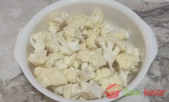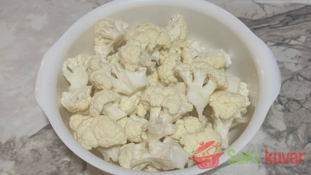 - Dok se bataci mariniraju, karfiol podelite na cvetove i kuvajte u kipućoj posoljenoj vodi 10 minuta.