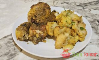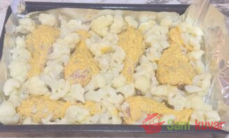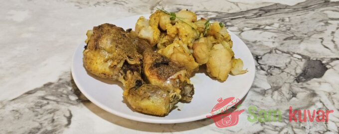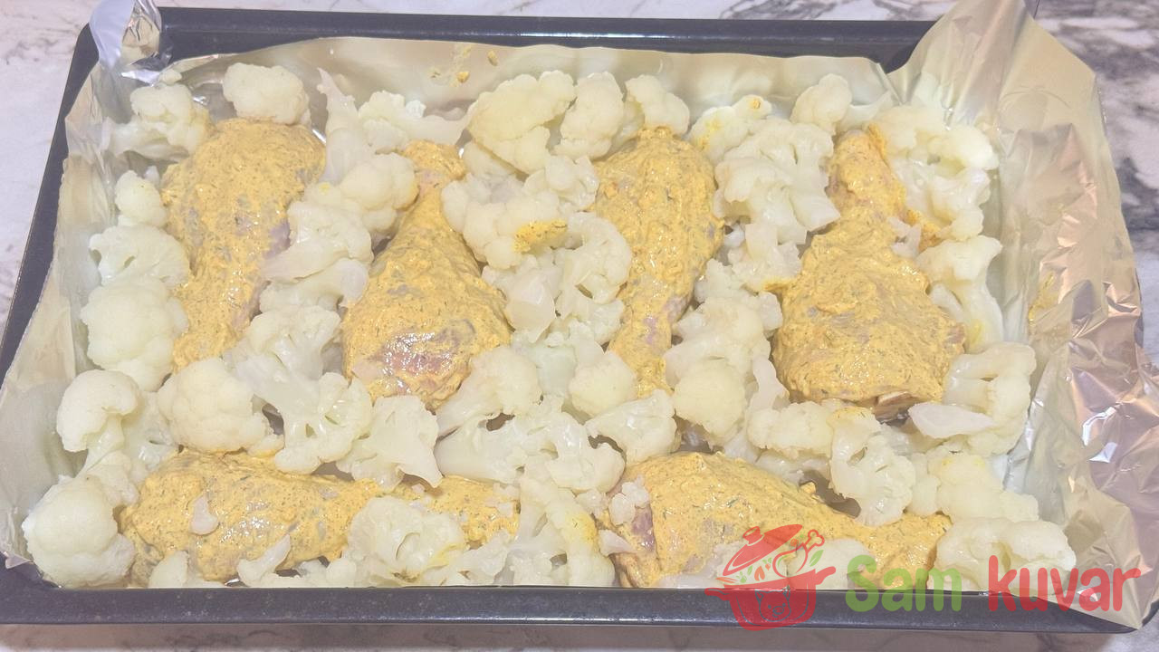 - Na pleh poređajte pileće batake, a zatim između njih rasporedite kuvani karfiol. Stavite u rernu zagrejanu na 200°C i pecite 40 minuta. Zatim izvadite pleh, uklonite poklopac ili foliju i vratite u rernu još 20 minuta kako bi se formirala hrskava korica.