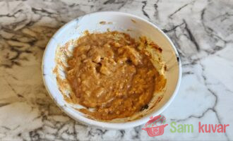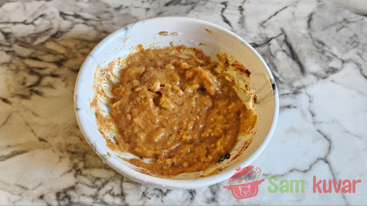 - Napravite marinadu: u činiji pomešajte majonez, beli luk protisnut kroz presu, mlevenu papriku, kurkumu, so i biber.