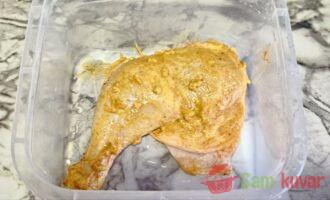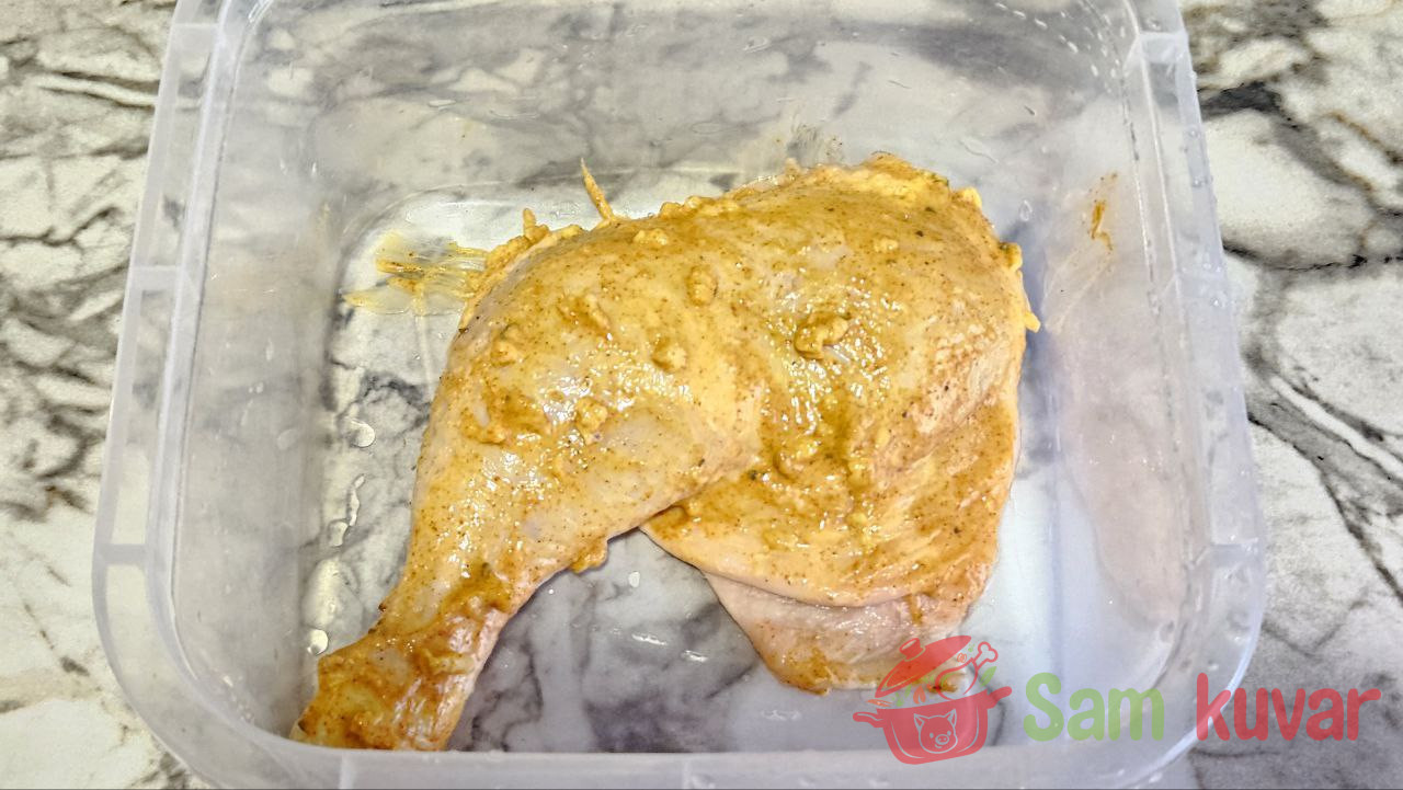 - Dobijenom marinadom premažite pileći batak i karabatak, pa ostavite da se marinira 10 minuta.