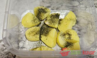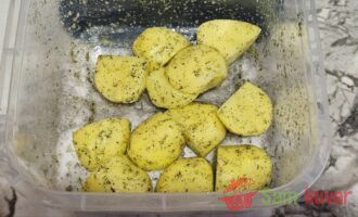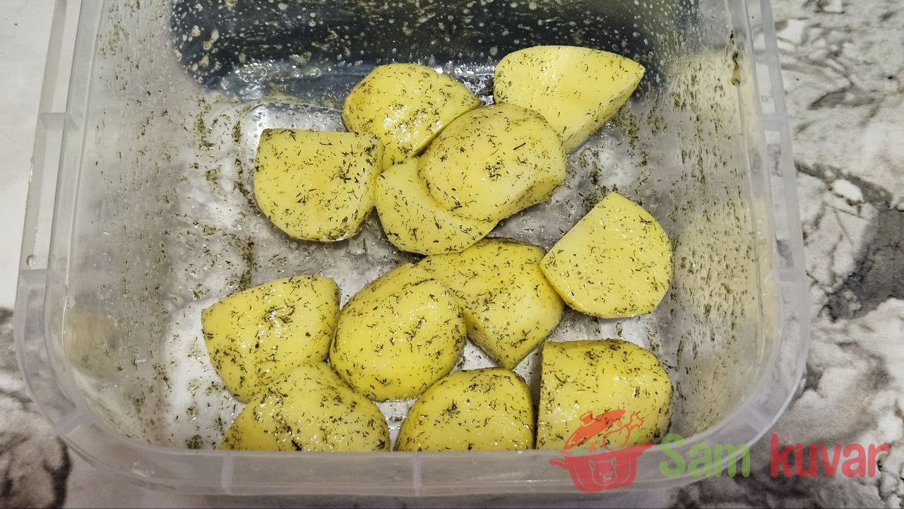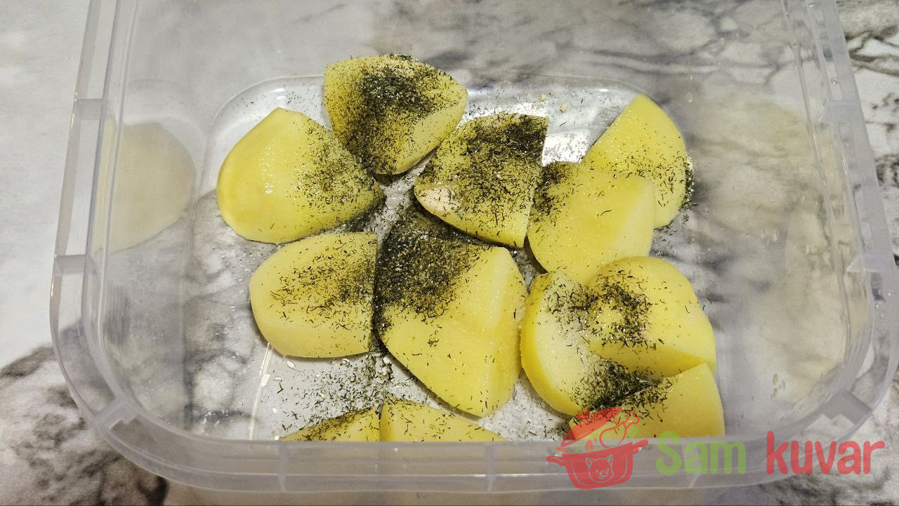 - Oljuštite krompir i isecite ga na krupnije komade. Dodajte suvu mirođiju, suvi beli luk, ulje i so. Dobro promešajte.