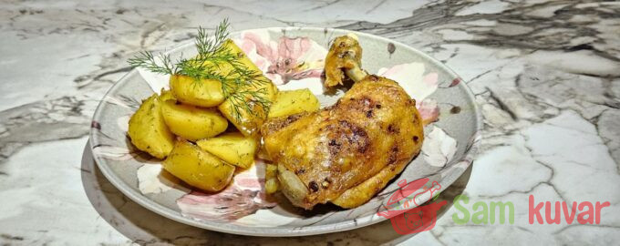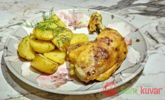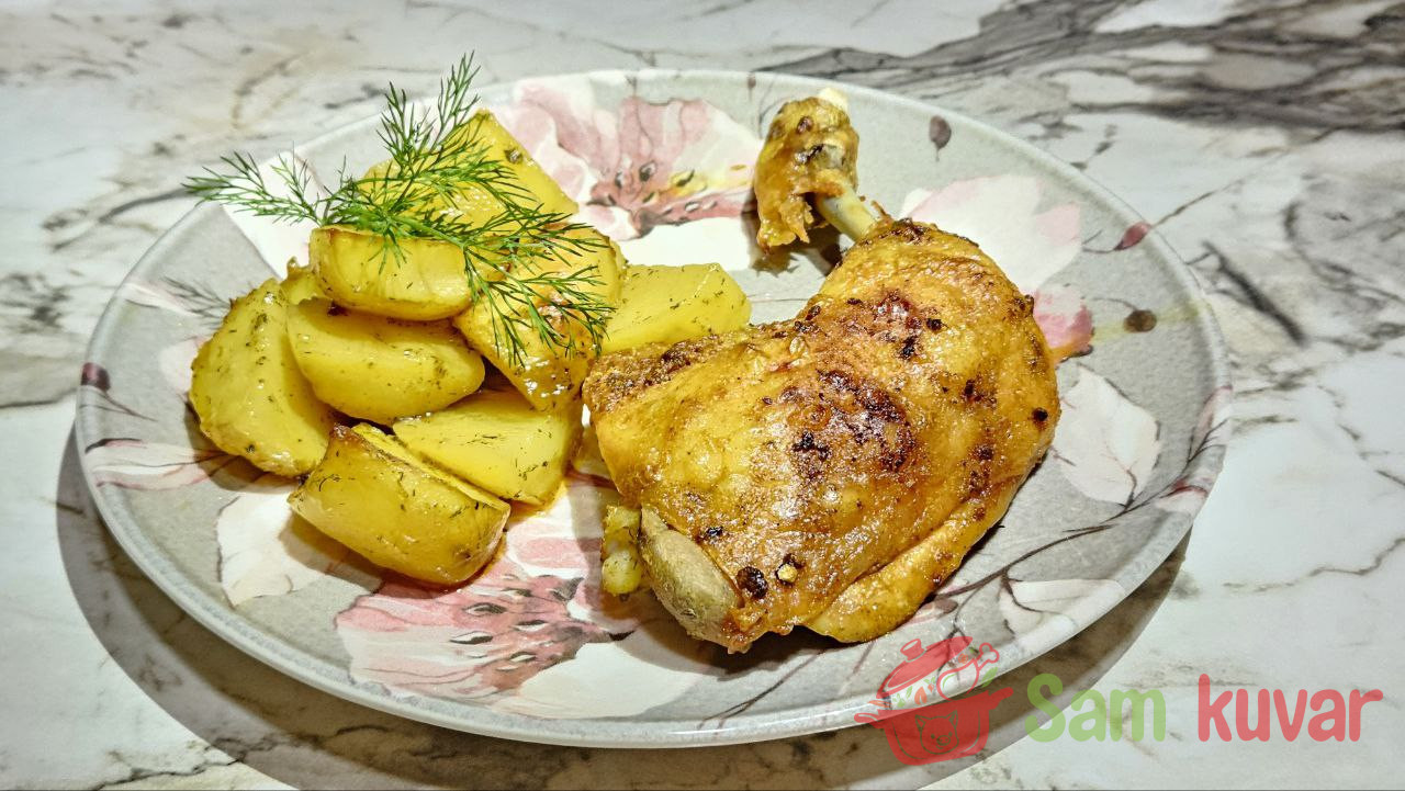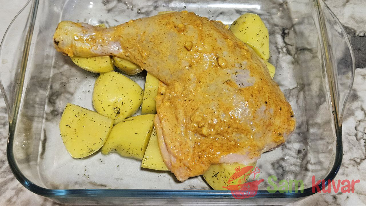 - U vatrostalnu posudu stavite krompir, a preko njega položite mariniranu piletinu. Tako će krompir upiti sokove i masnoću iz mesa.