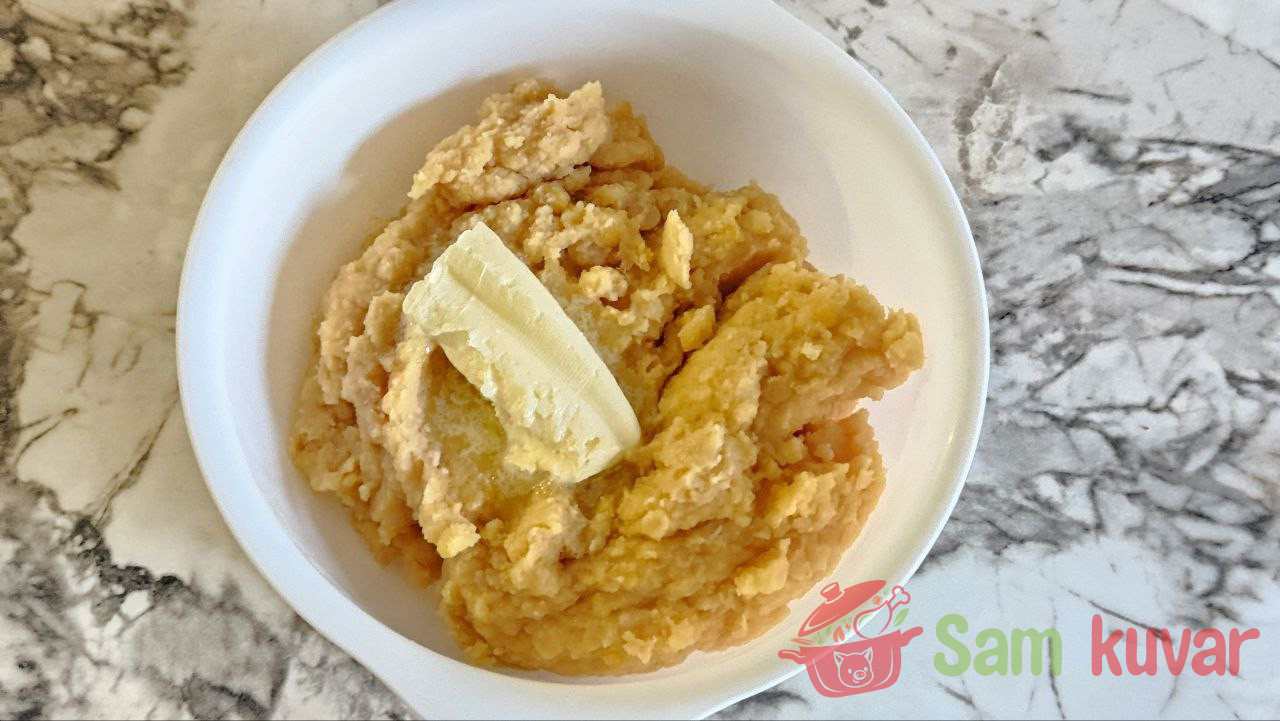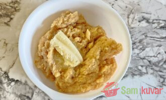- Gotov pire prebacite u posebnu posudu, dodajte maslac i dobro izgnječite gnječilicom za pire. Umutite mikserom da biste dobili dodatnu prozračnost.