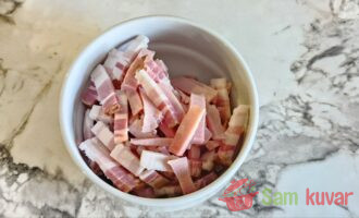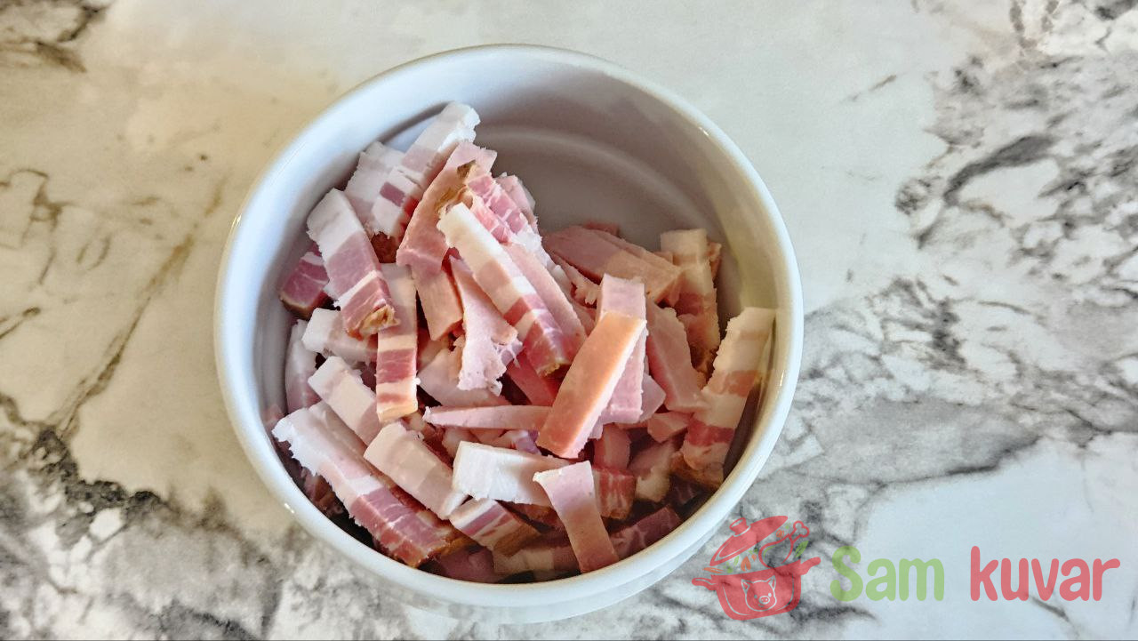 - Isecite dimljeno meso i slaninu na sitnije komade.