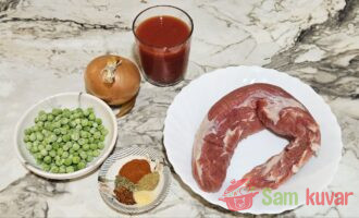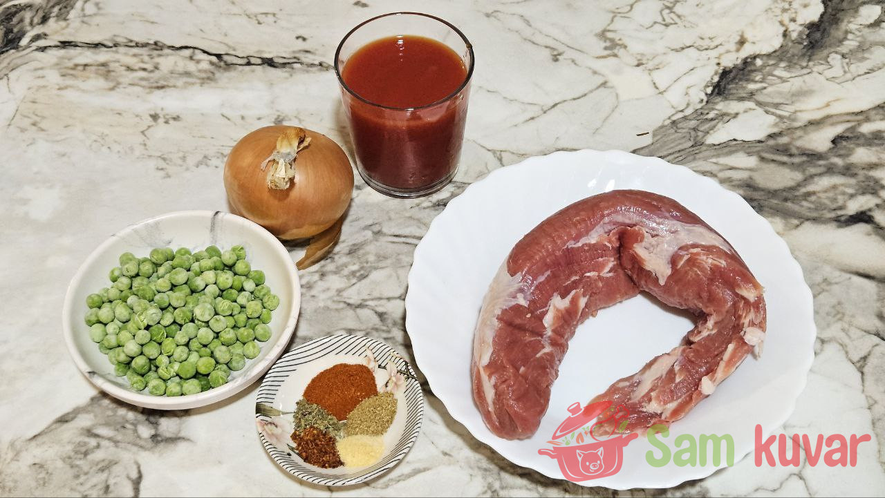 - Pripremite sve sastojke za pirjanu svinjetinu sa graškom.