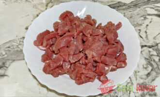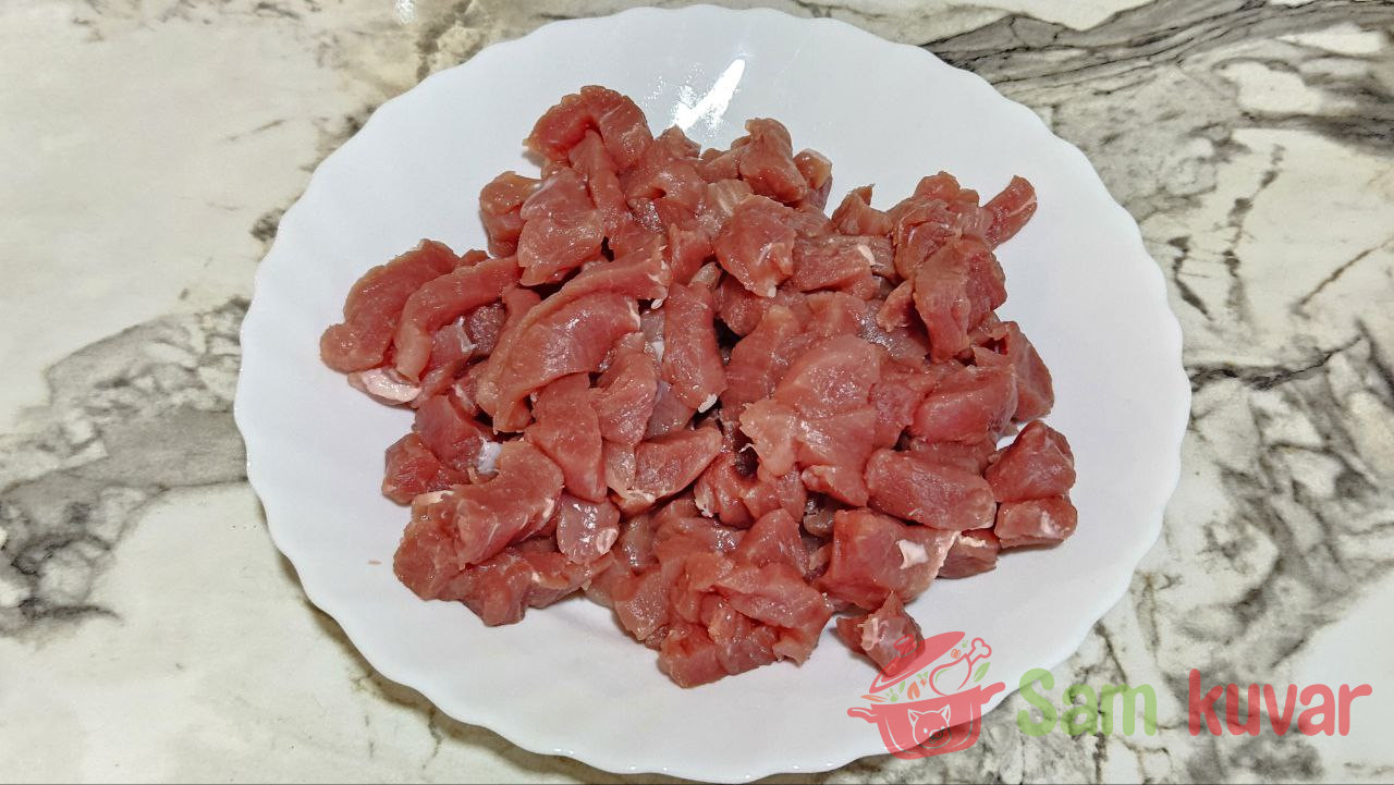 - Svinjetinu isecite na trake.