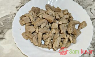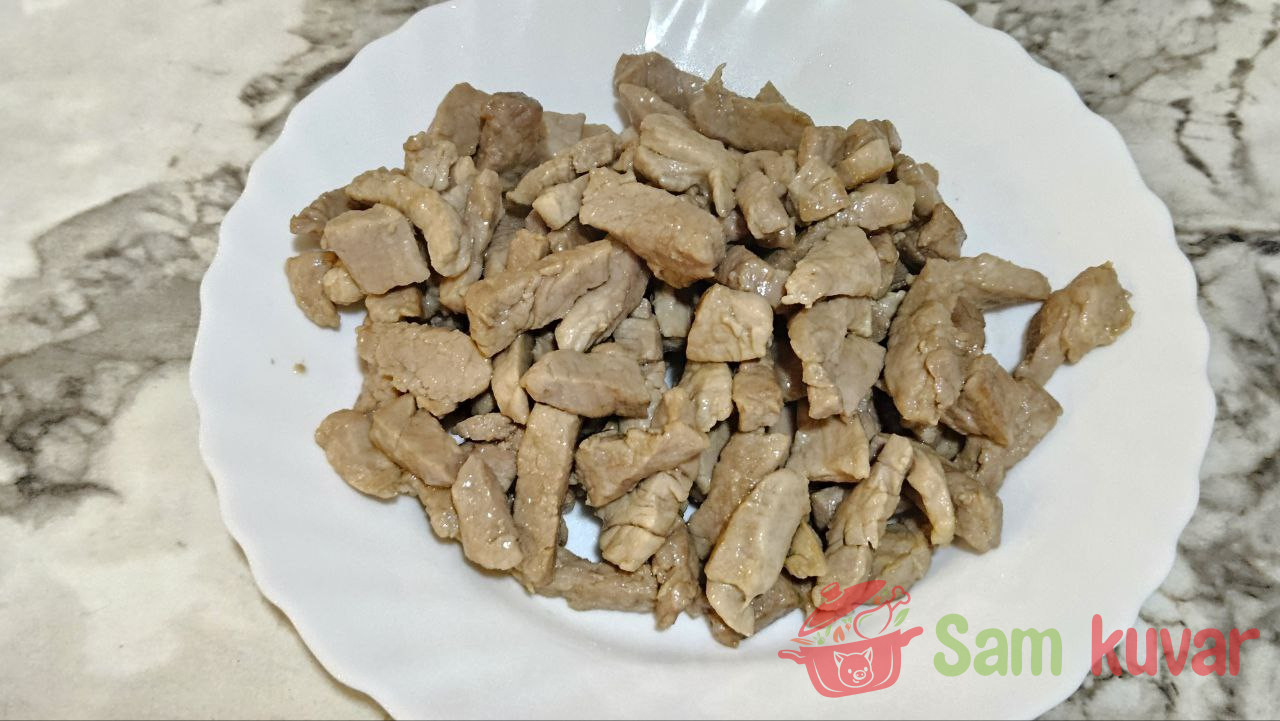 - Na zagrejanom tiganju sa malo biljnog ulja propržite svinjetinu dok ne dobije blagu zlatastu koricu. Tokom prženja malo posolite. Izvadite meso na tanjir.