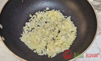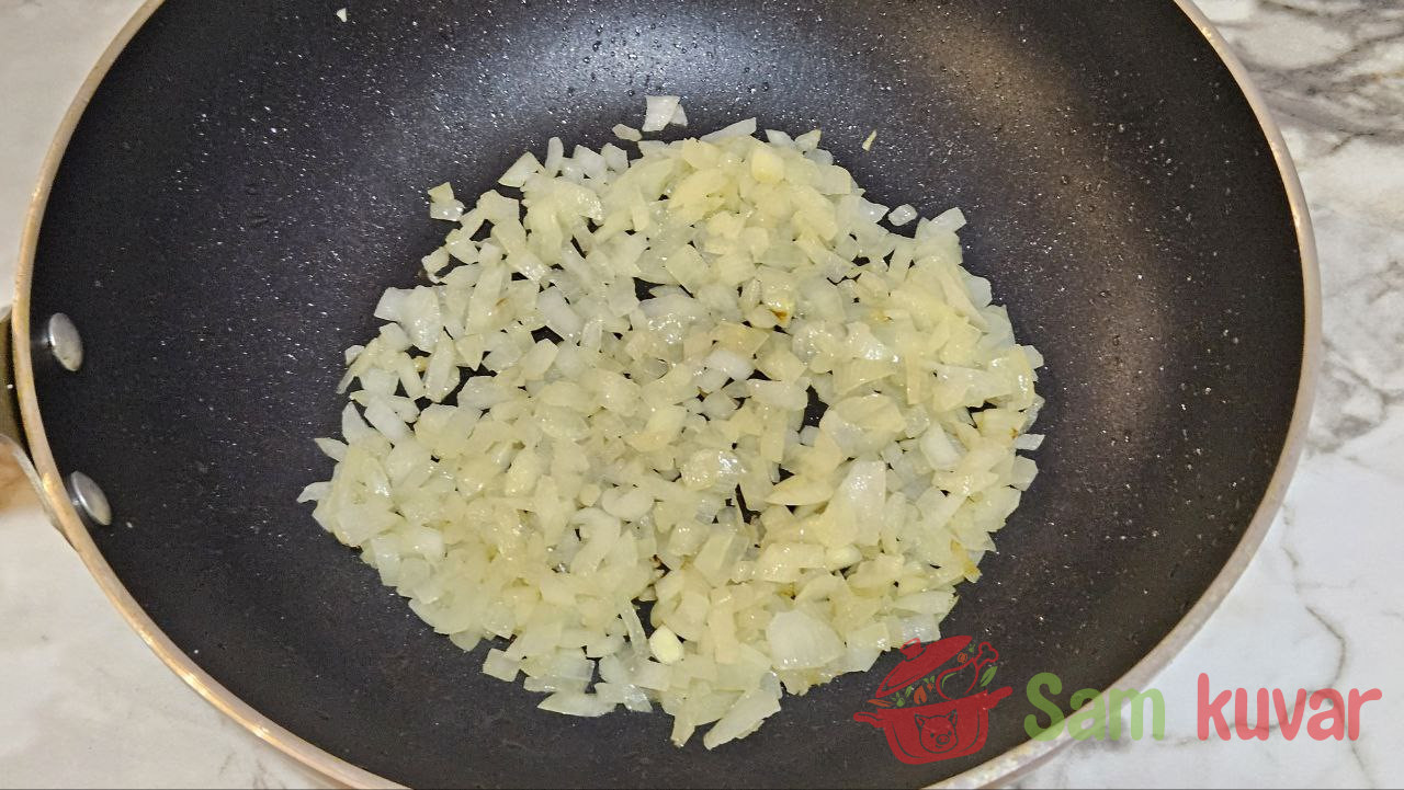 - Sitno iseckajte luk i ispržite ga u istom tiganju dok ne postane providan.