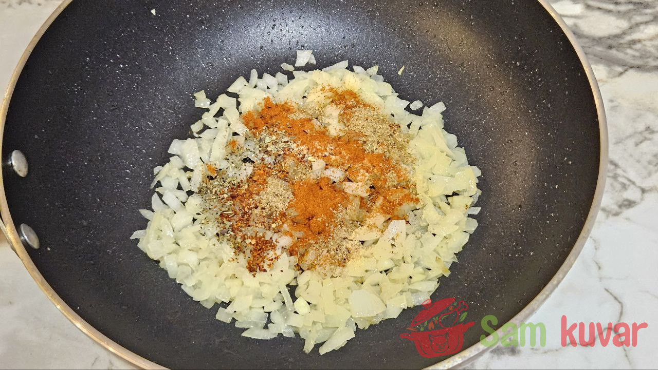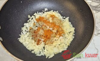 - Dodajte sve začine, dobro promešajte i pržite 1 minut.