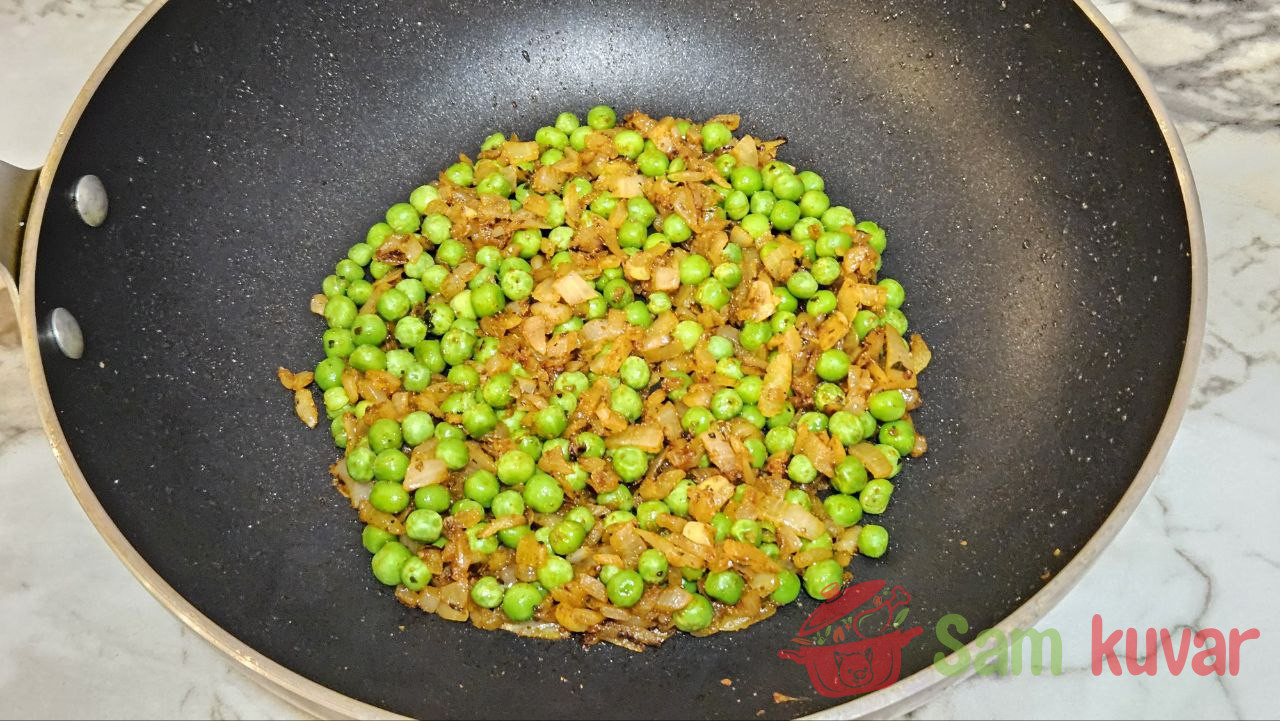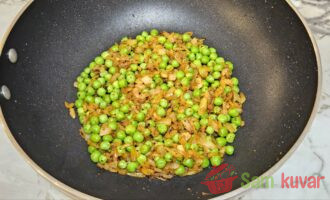 - Zatim dodajte grašak i pržite ga 2–3 minuta uz mešanje.