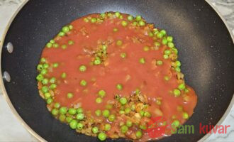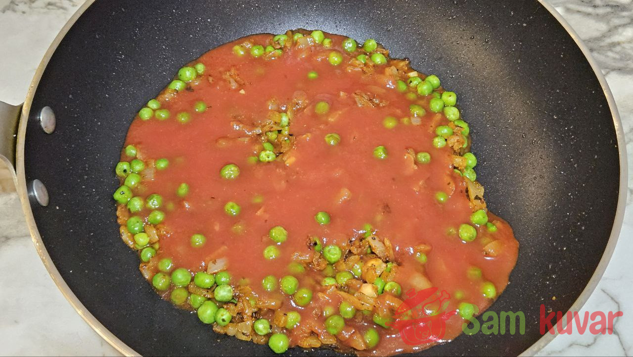 - U tiganj sa lukom i graškom dodajte tomatni pire i vodu, malo posolite i dobro promešajte.