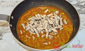 - Kada sos proključa, vratite svinjetinu u tiganj, promešajte i pirjajte na laganoj vatri pod poklopcem 40 minuta.