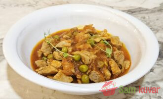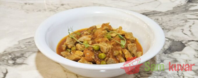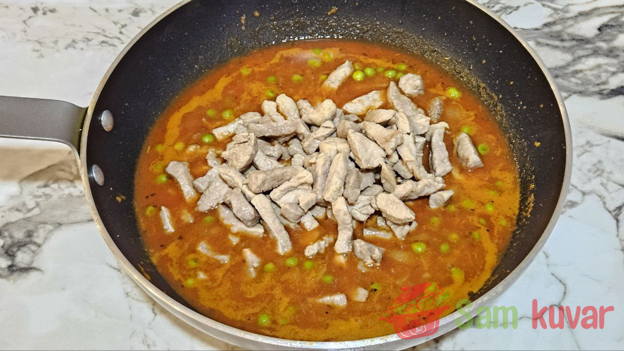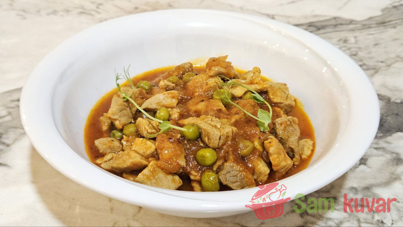 Recept za pirjanu svinjetinu sa graškom otkriva puni ukus mesa koje se lagano kuva u paradajz sosu sa začinima.