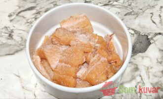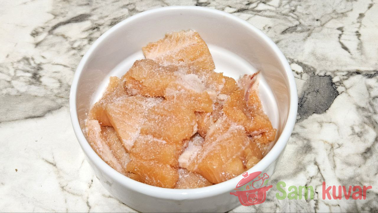 - File ribe operite, očistite od kože i kostiju, pa isecite na manje komade. Posolite i dobro promešajte.