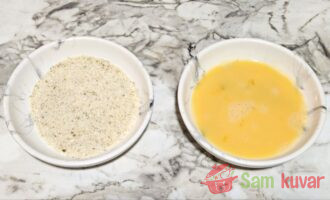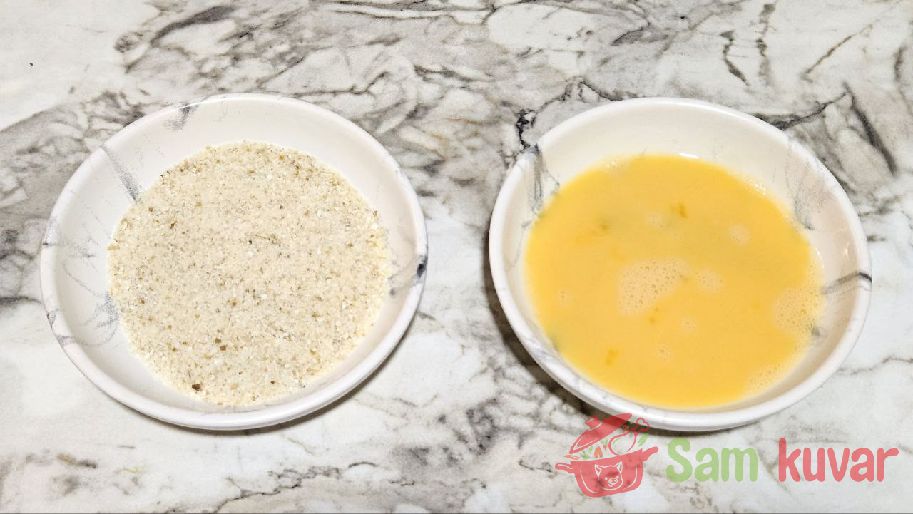 - Pripremite paniranje. U jednu činiju razbijte jaje i viljuškom ga umutite. U drugoj činiji pomešajte prezle sa malo soli.