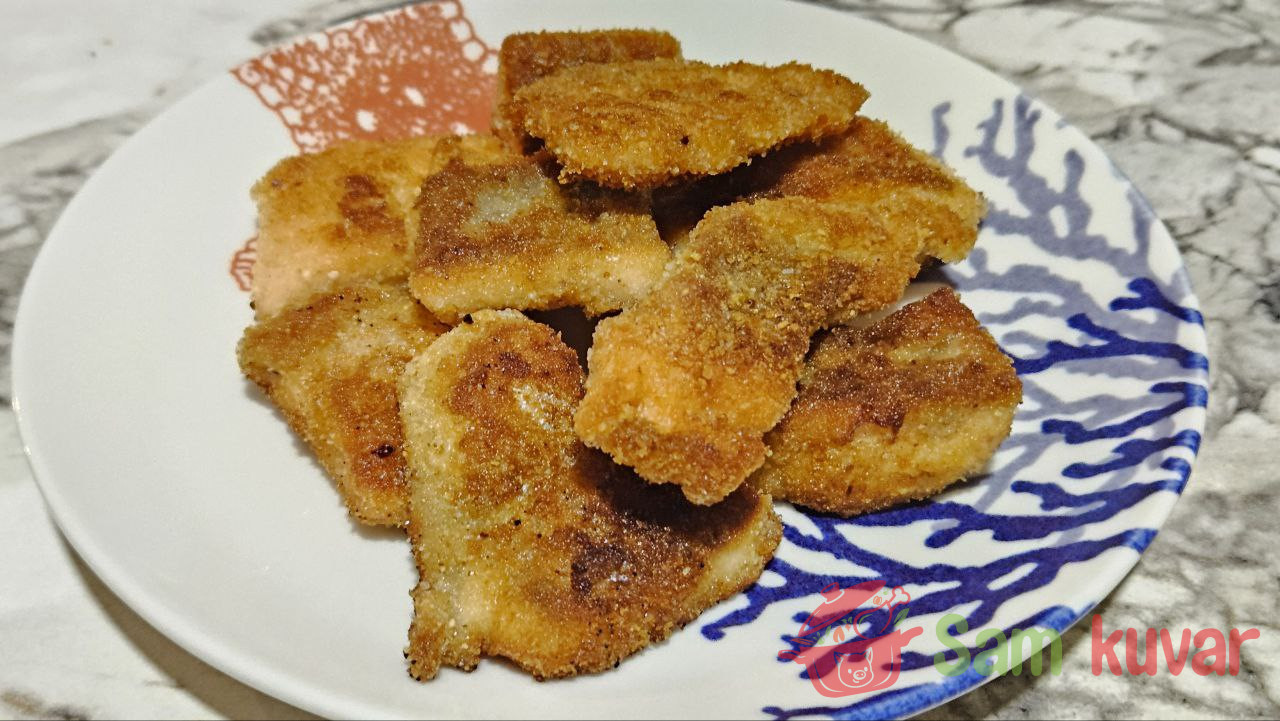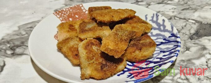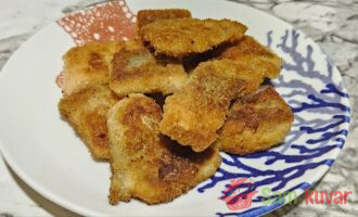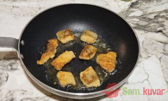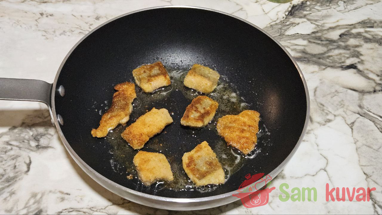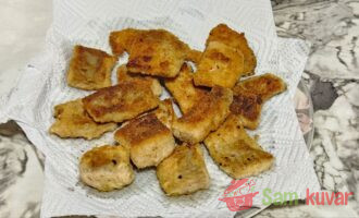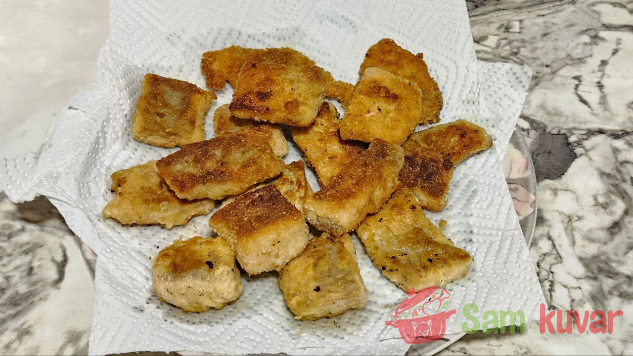 - Ispržene komade stavite na tanjir obložen papirnim ubrusom da upije višak ulja.