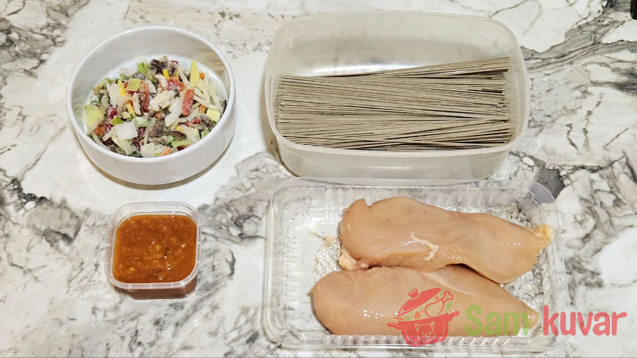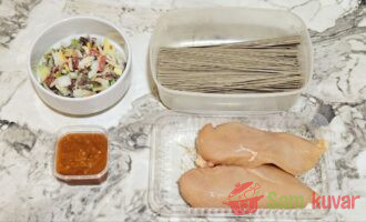 - Pripremite potrebne sastojke za pripremu rezanaca sa piletinom u čili sosu na kineski način.